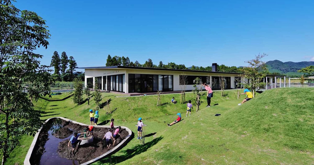 The KFB Kindergarten and Nursery incorporates the Shirasu Plateau's natural terrain to foster creative and physical play for children.