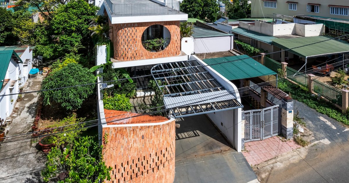 The architecture of Khang’s House prioritizes a seamless connection between indoor and outdoor spaces. The façade features exposed brick walls with subtle gaps, creating an artistic interplay of light and air circulation. At night, strategic lighting highlights the brick gaps, producing a shimmering effect that transforms the exterior into a visual delight. A large circular window on the upper floor serves as both a design focal point and a source of natural light, connecting the interior with the surrounding environment.