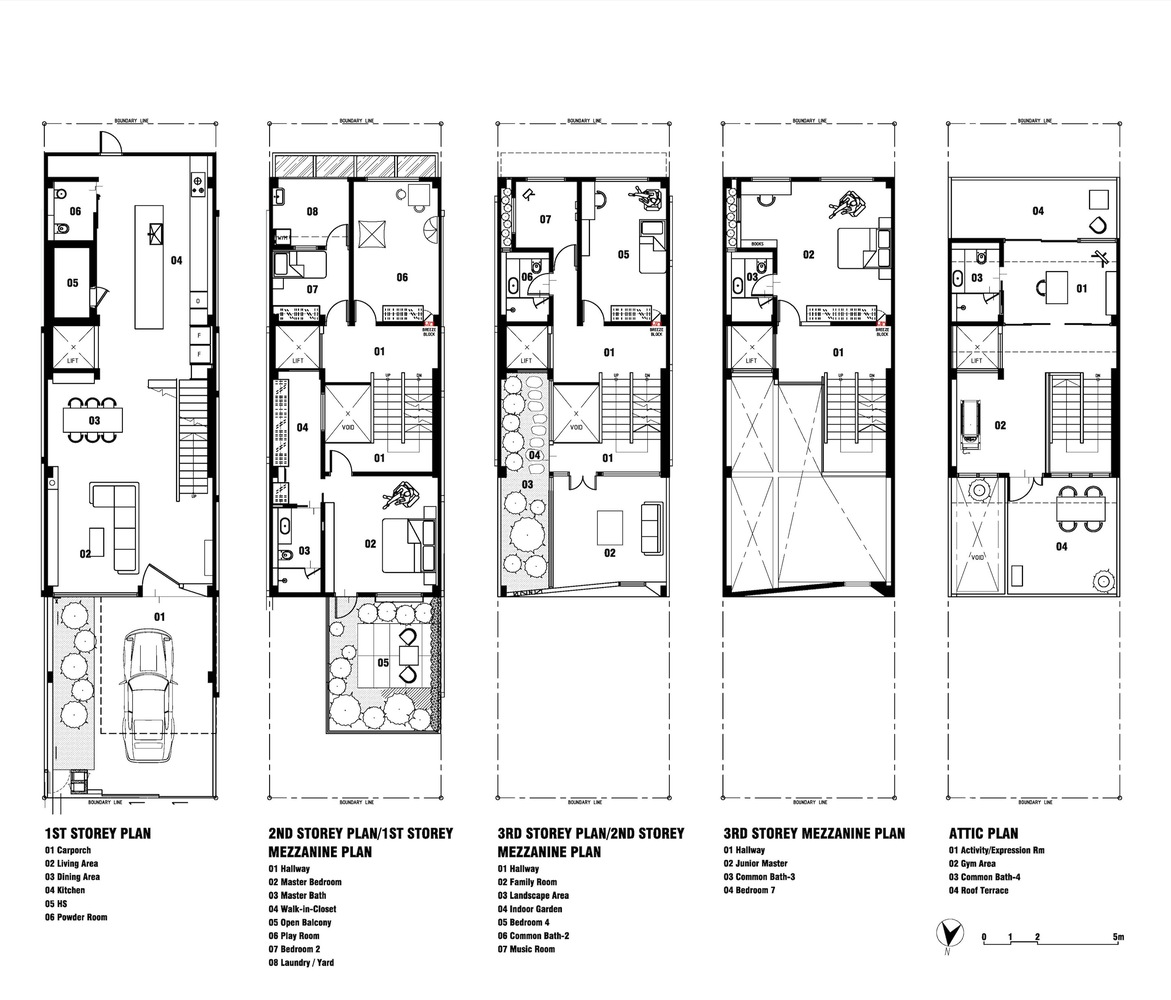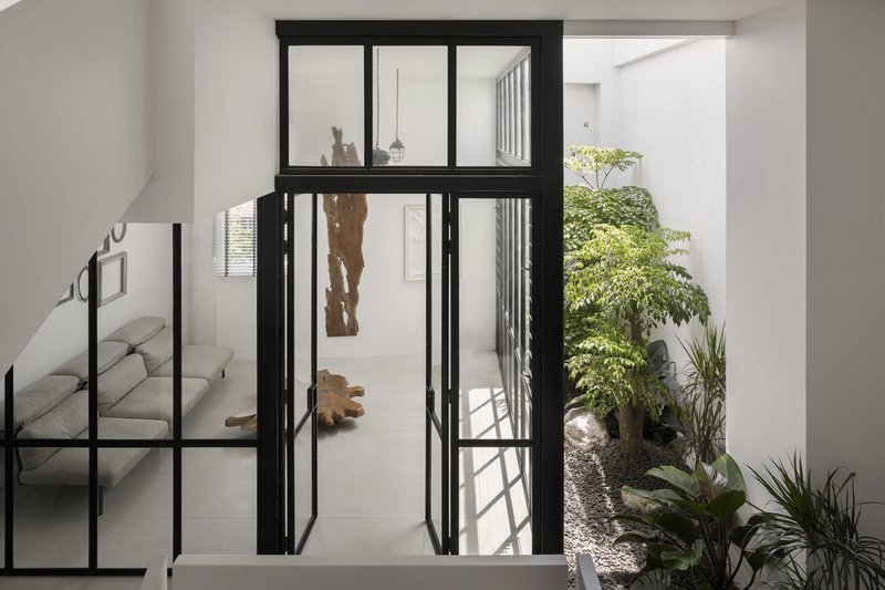On the third level, Kirigami House features an indoor garden that seamlessly integrates with the family room. Full glass panels on two sides of the room create a connection to the natural environment, allowing residents to enjoy the beauty of nature while inside. This fusion of indoor and outdoor spaces maximizes natural light and airflow, improving the overall living experience.