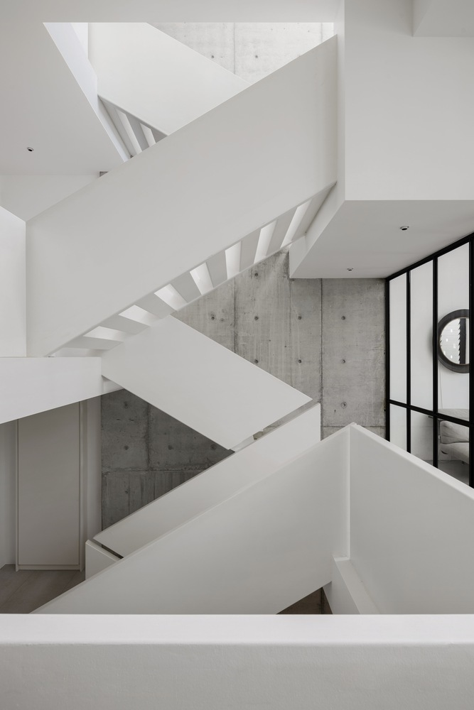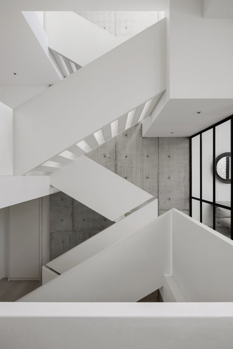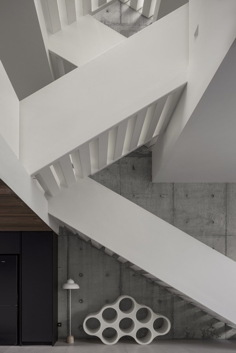 The design of the staircase also draws inspiration from the kirigami concept. The staircase filters natural light between levels, enhancing the flow of light throughout the house and creating a visual connection between different areas. This thoughtful design element contributes to the home’s overall sense of openness and tranquility.