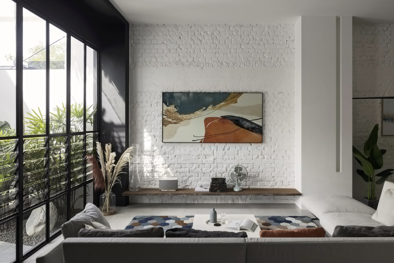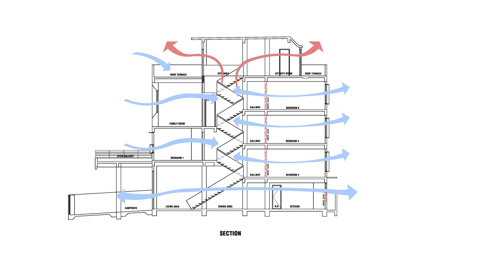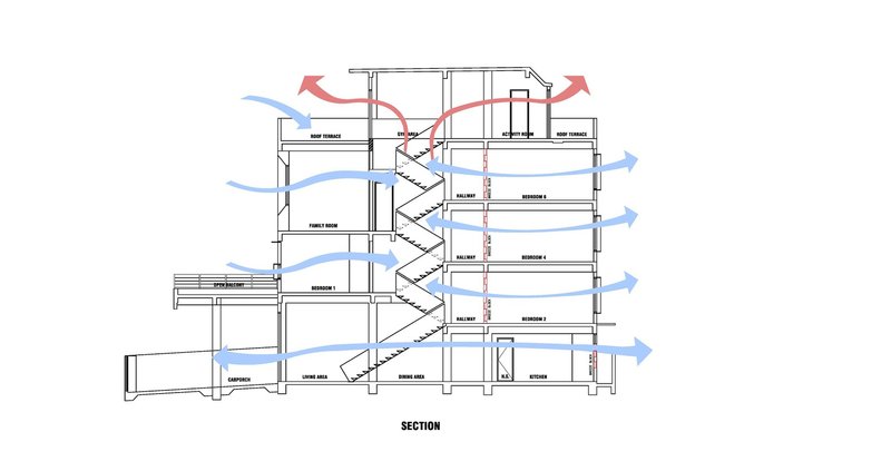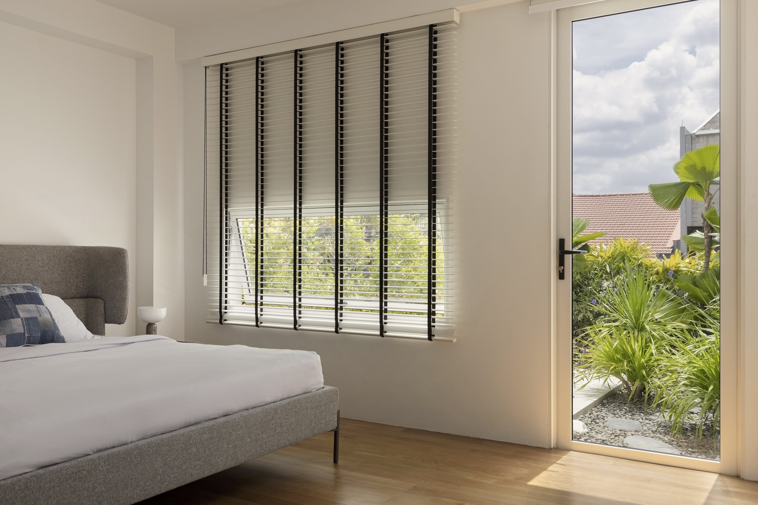 Kirigami House is designed to offer a balance between private and communal spaces. To ensure comfort and flexibility, the design incorporates flip doors behind the breeze blocks in the bedrooms. These doors can be adjusted to control natural ventilation or air conditioning, providing optimal comfort in all seasons.