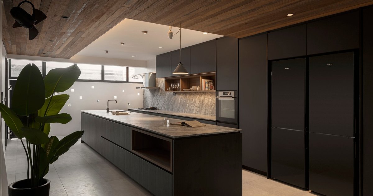 One of the striking features of the interior design is the contrast between the living and kitchen areas. The kitchen is marked by a lowered wooden ceiling and dark-colored materials, creating a more intimate atmosphere. The textured granite used for the backsplash and kitchen island adds a tactile dimension, making the kitchen a central hub for family gatherings and entertaining guests.