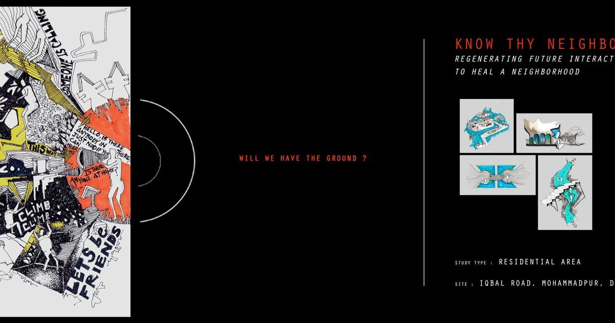 Know Thy Neighbor is an explorative urban regeneration architecture project that addresses the gradual erosion of community life within dense metropolitan environments. Set in Dhaka, Bangladesh, the proposal examines how rapid urbanization, economic pressures, and changing lifestyles have fragmented social relationships and weakened neighborhood identity. The project responds by reimagining interactive public spaces as catalysts for social healing, cultural exchange, and collective belonging.