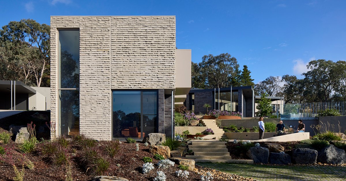 Korinda House is not a singular architectural gesture but a constellation of masonry volumes that cascade along the slope. Each block is clad in raw, earth-toned timbercrete, giving a tactile, robust, and weathered character reminiscent of the surrounding bush. Private spaces—including the master suite, painting studio, and children’s bedrooms—feature generous daybed nooks that capture sunlight, while interiors are softened with v-groove timber boards, recycled timber floors, and expressive wallpapers, creating a warm and intimate atmosphere.