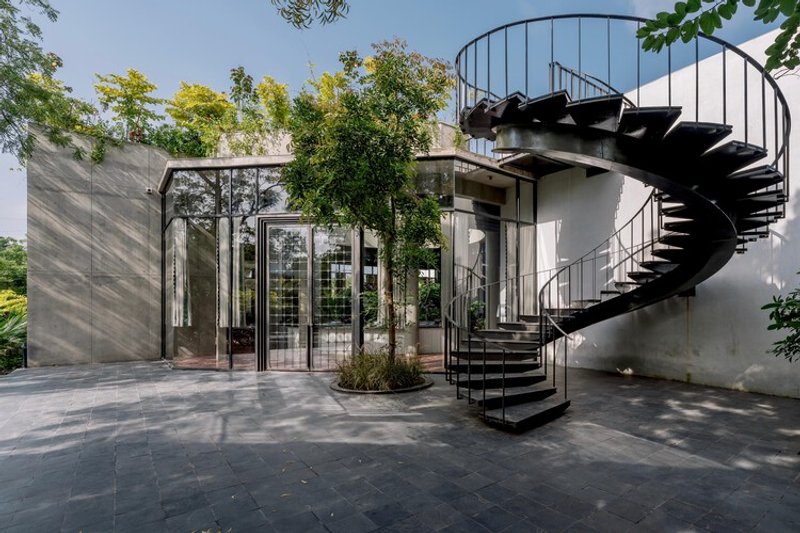 - Views of foliage soften the raw materials and introduce a soothing green palette.