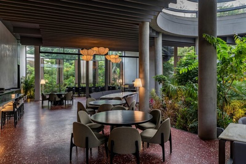 This seamless merging of architecture and landscape creates an immersive dining environment shaped by light, greenery, and openness.