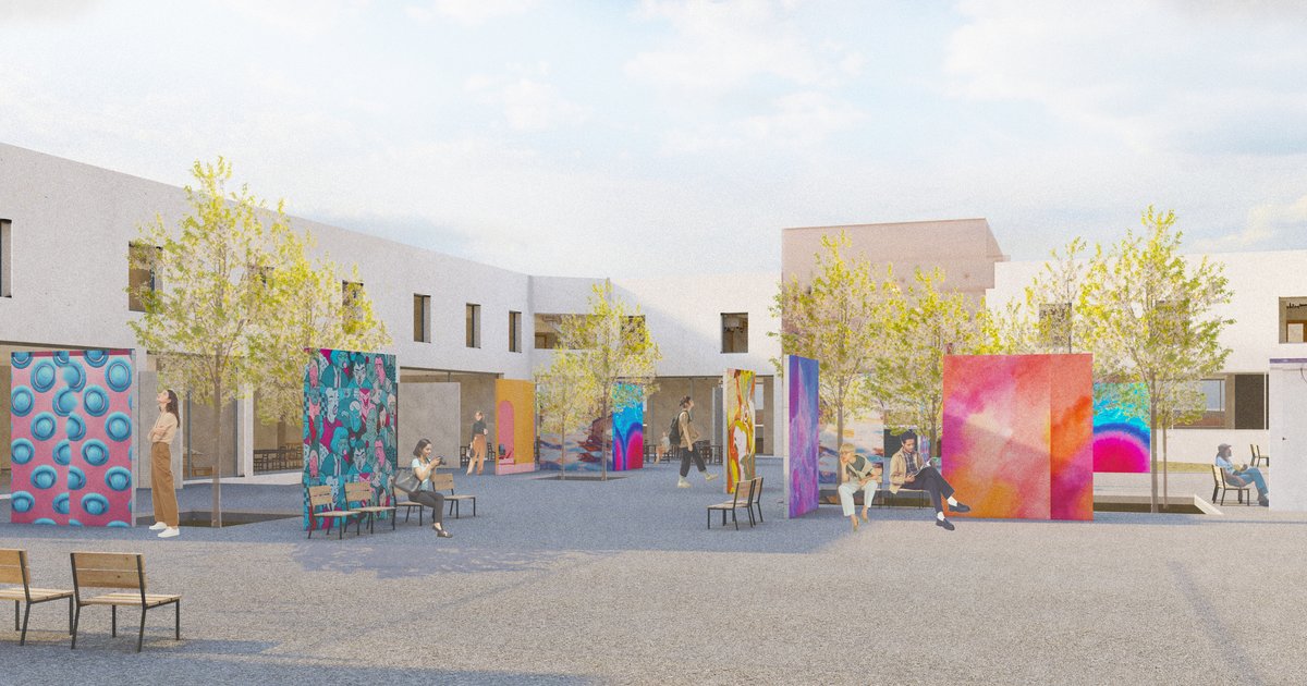 Art and creation have a main voice in the space. Architecture has been just a background and forms a coherent whole with art while blending with it. Cubes, consisting of small coloured glasses, were placed at the entrances to the building. This solution gets the user of the space into the artistic atmosphere, at the same time being an artistic expression and an architectural element. Another thing that has been placed in the main square, workshop spaces and galleries are walls. They allow the space to change over time - walls will change their places and new art will appear. Thanks to that the place will look differently depending on the time when you visit it. Movable walls, which are both inside and outside, allow the space to be transformed according to needs. Because of that it is attractive to the viewer regardless of the number of visits.