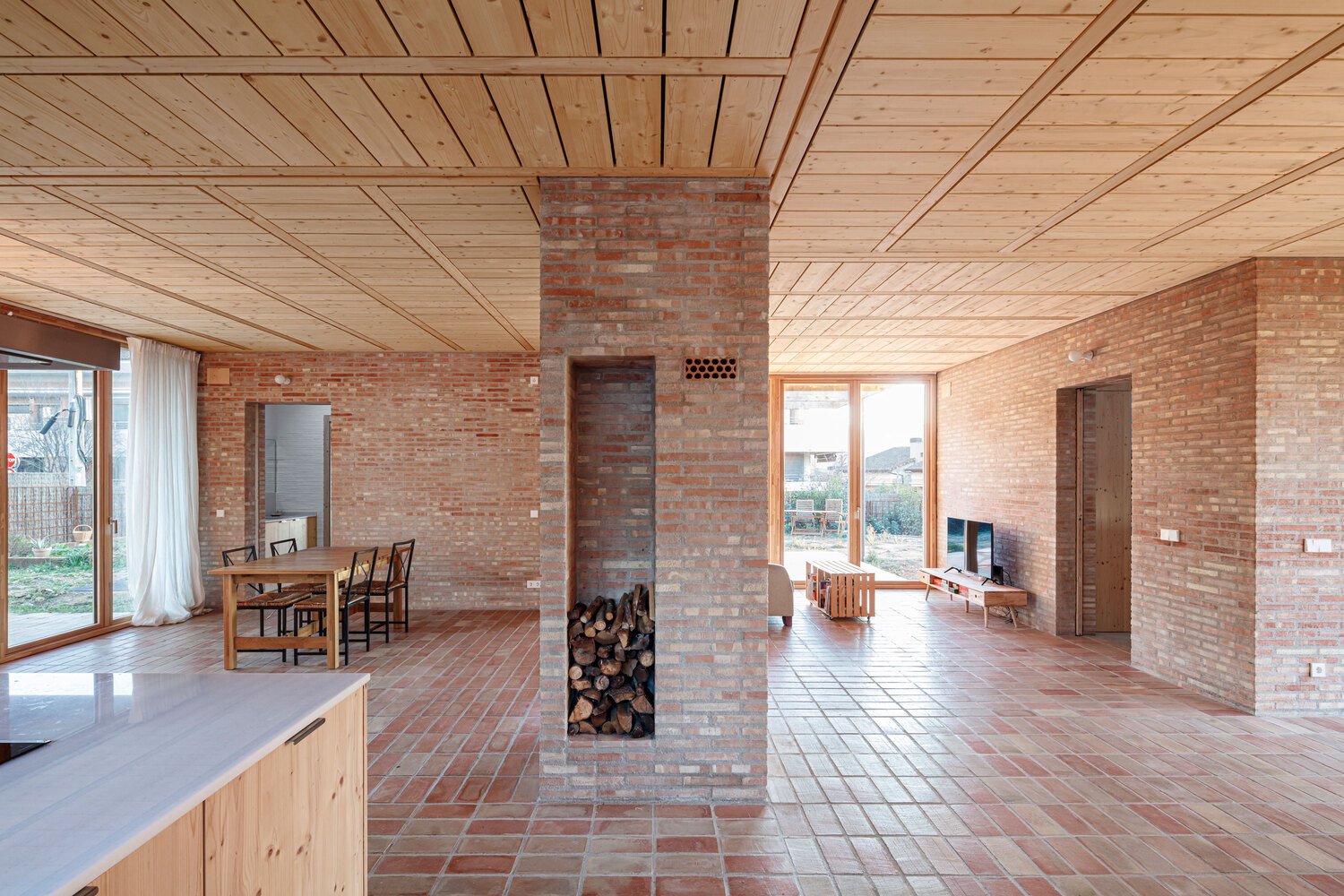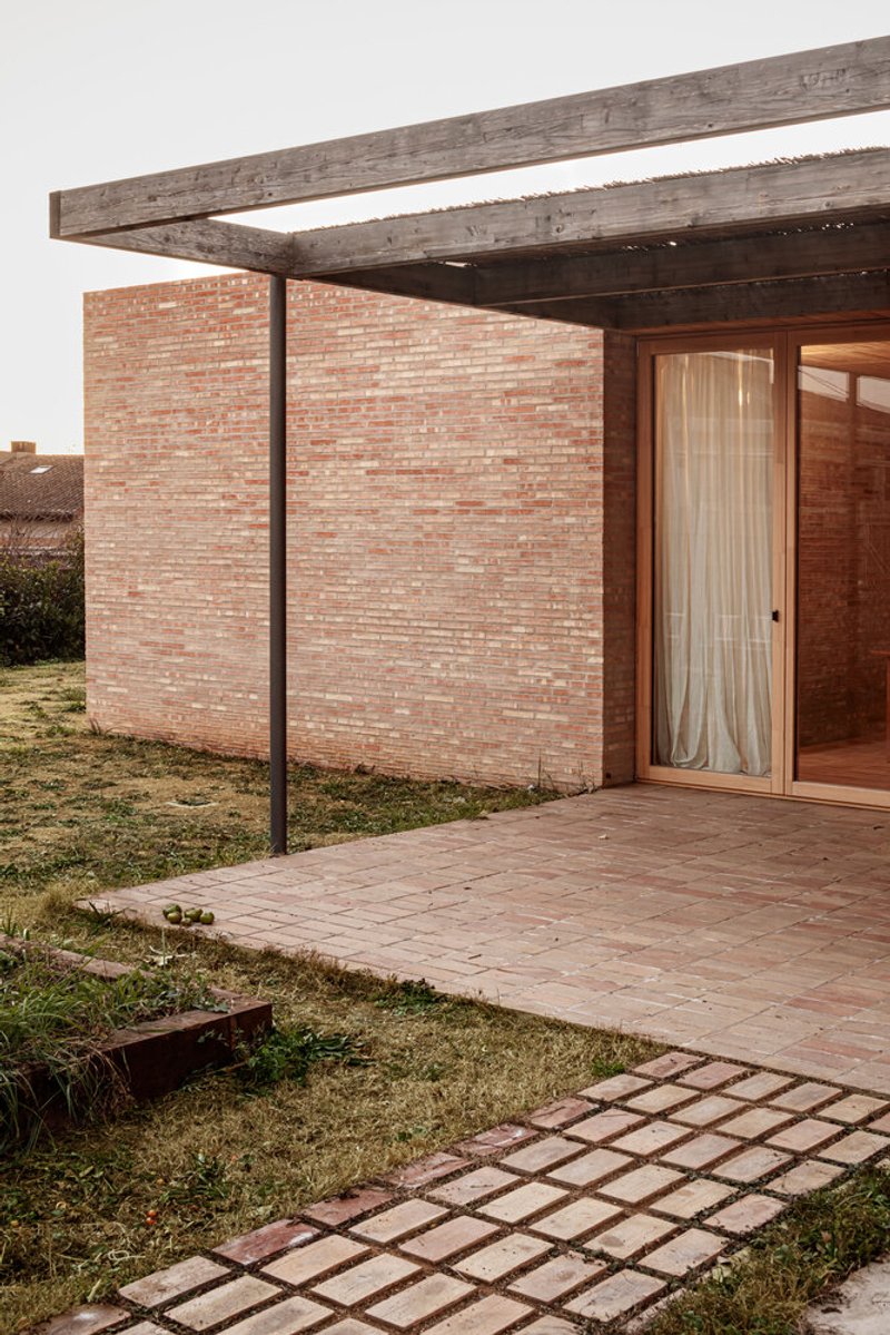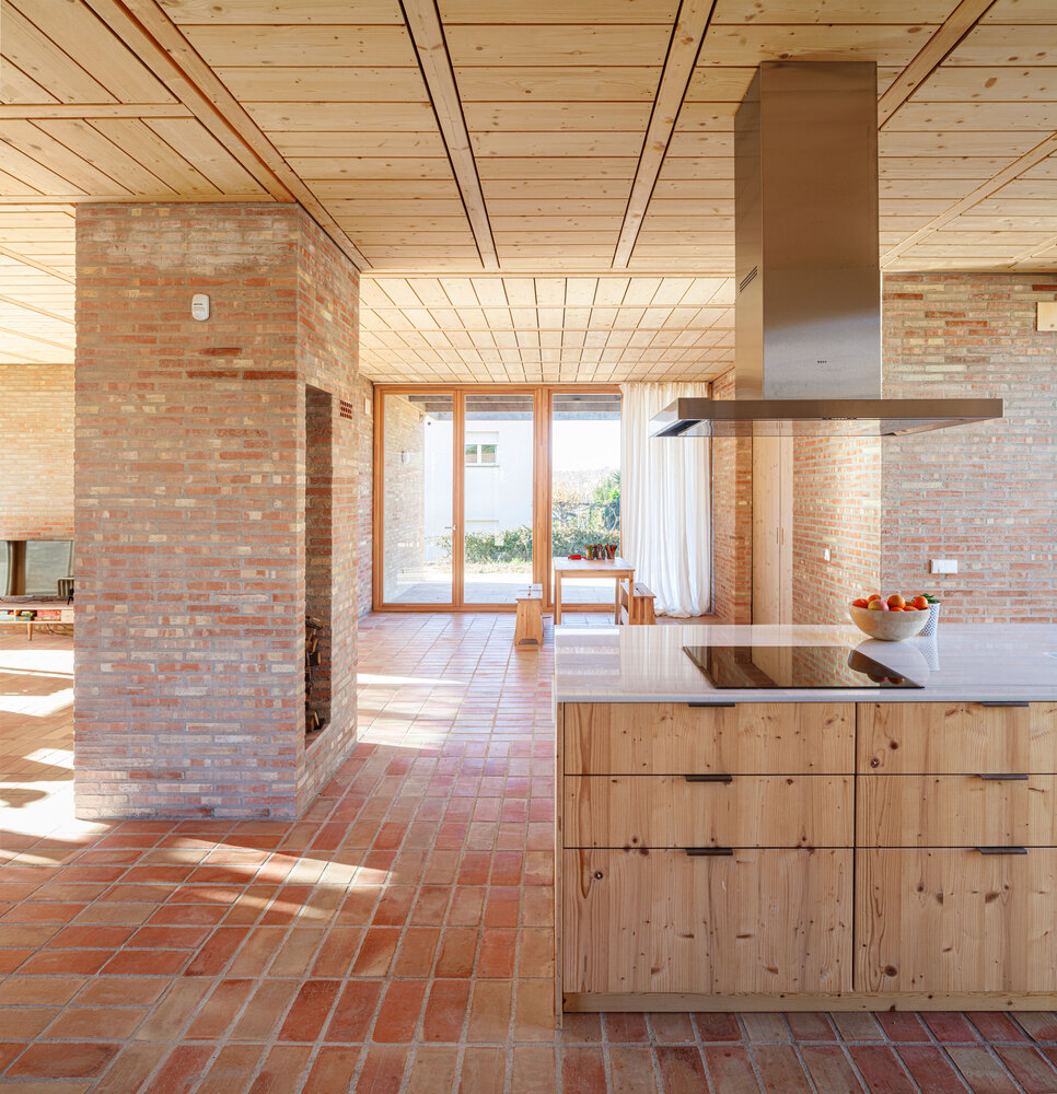 The site offered excellent orientation but limited privacy, inspiring a design strategy focused on shelter and intimacy. The house is organized around a central fireplace and four distinct brick volumes. These compact ceramic boxes, positioned at the ends of the house, accommodate the bedrooms and bathrooms, creating a private, tranquil environment for the residents.