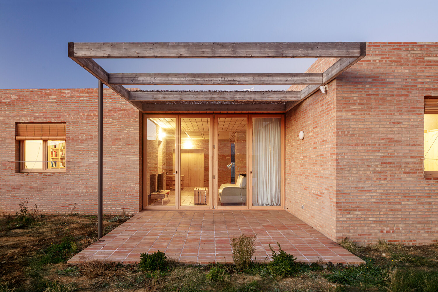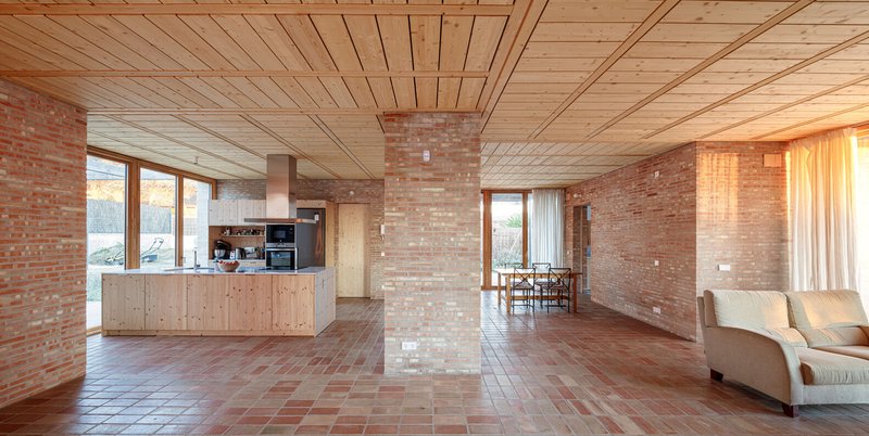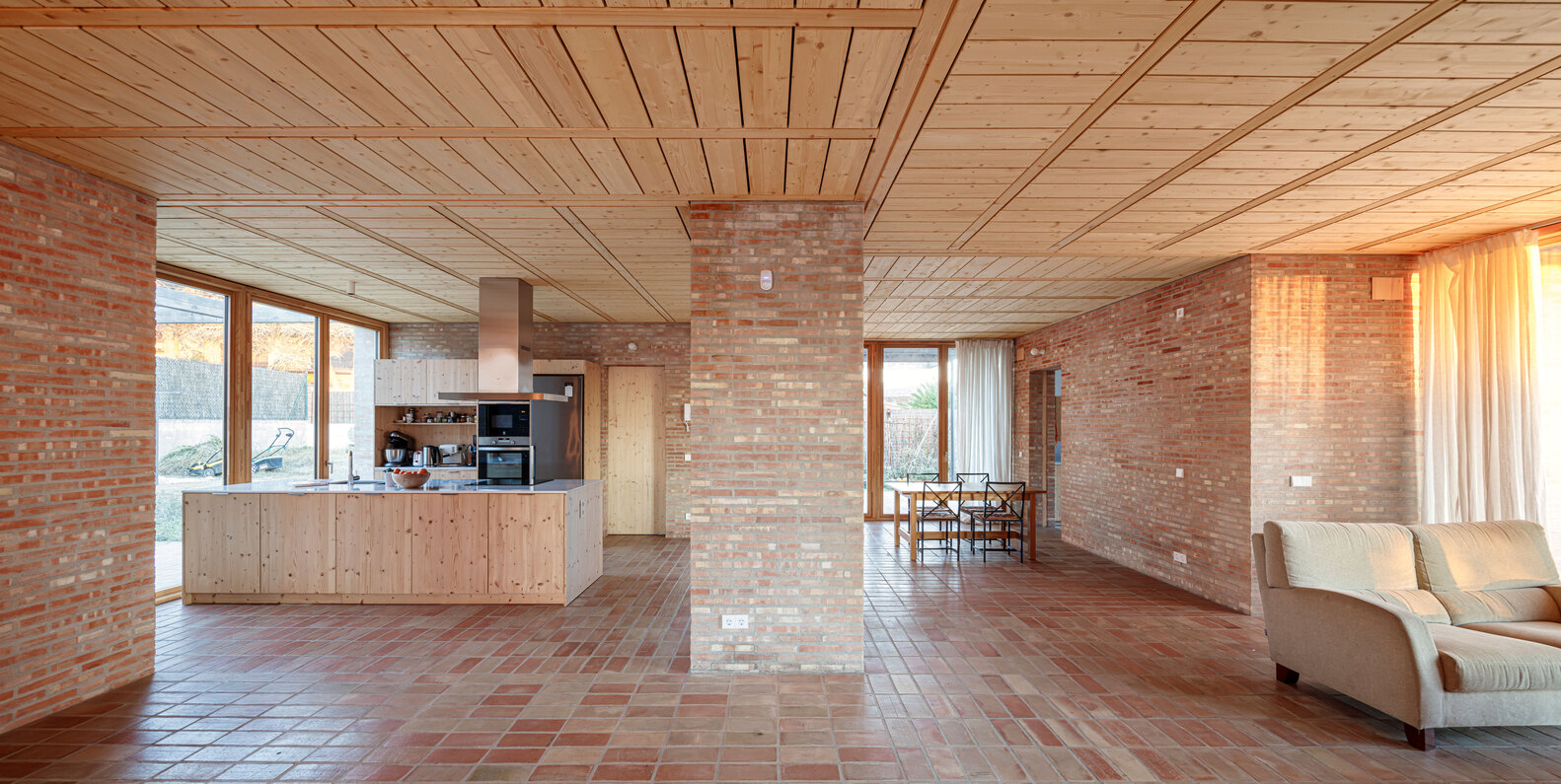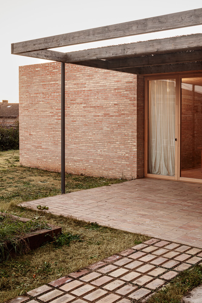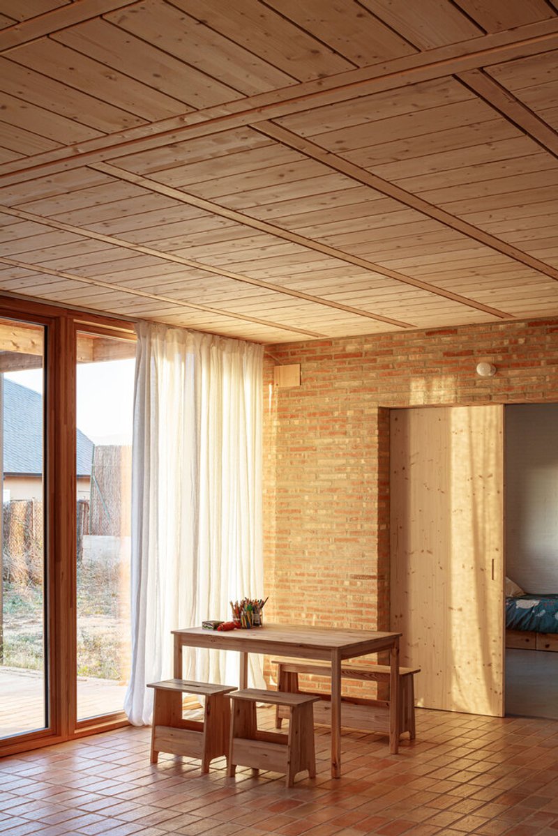 The use of solid manual ceramic bricks defines both the structural and aesthetic character of the home. The same brick is used for the interior floors, creating a modular rhythm throughout the common spaces. These ceramic walls are the primary vertical load-bearing elements supporting the roofs. Within the private boxes, the roof is constructed with metal joists and ceramic vaults, while the day areas and porches feature light pine wood trusses, enhancing warmth and texture.