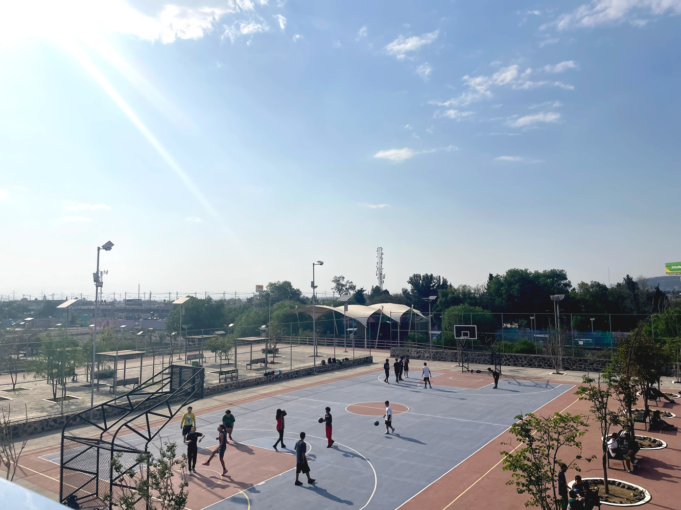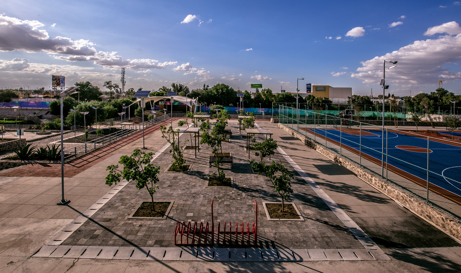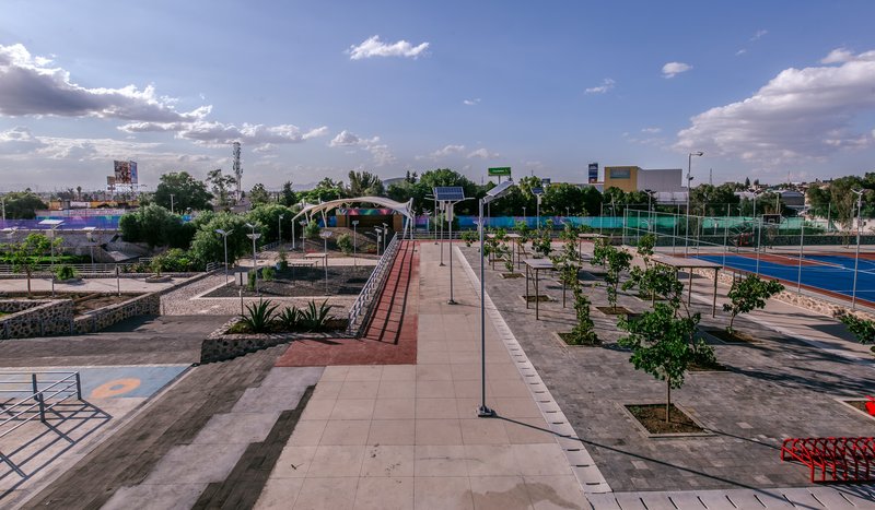The park occupies a 3.8-hectare site, integrating local volcanic stone platforms, plazas, and walkways that follow traditional Mexican landscape techniques. This approach creates a network of pedestrian-friendly routes aligned north-south and east-west. Native and endemic vegetation enhances biodiversity, triples the tree cover, and fosters a resilient ecosystem.
