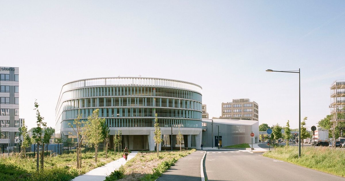 - Triangular Building: Featuring rounded angles and clad in vertical metal strips, this structure houses the vehicle access ramps and a 200-place bicycle storage area, encouraging active mobility.