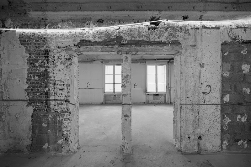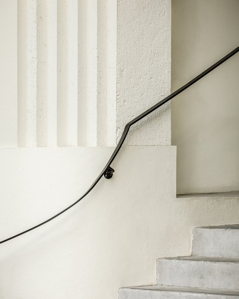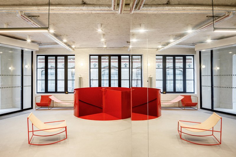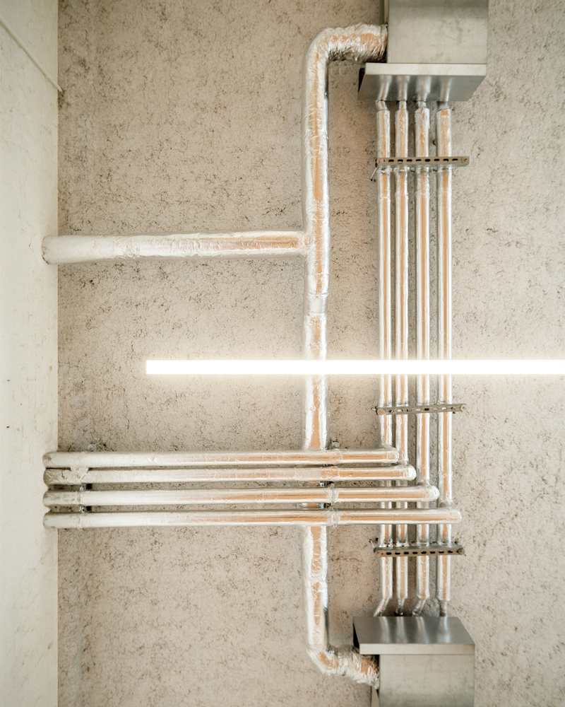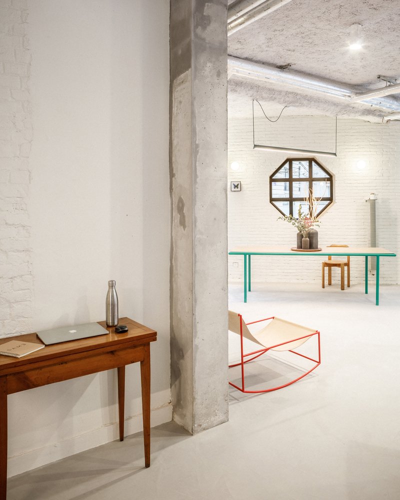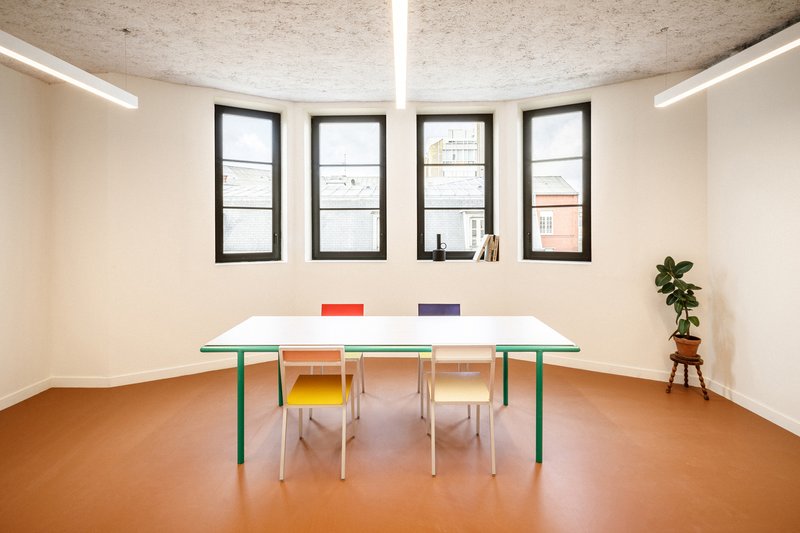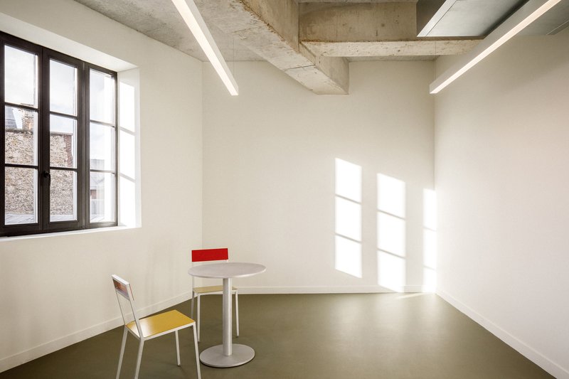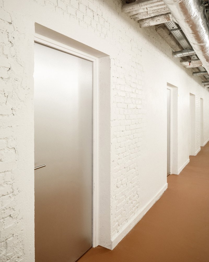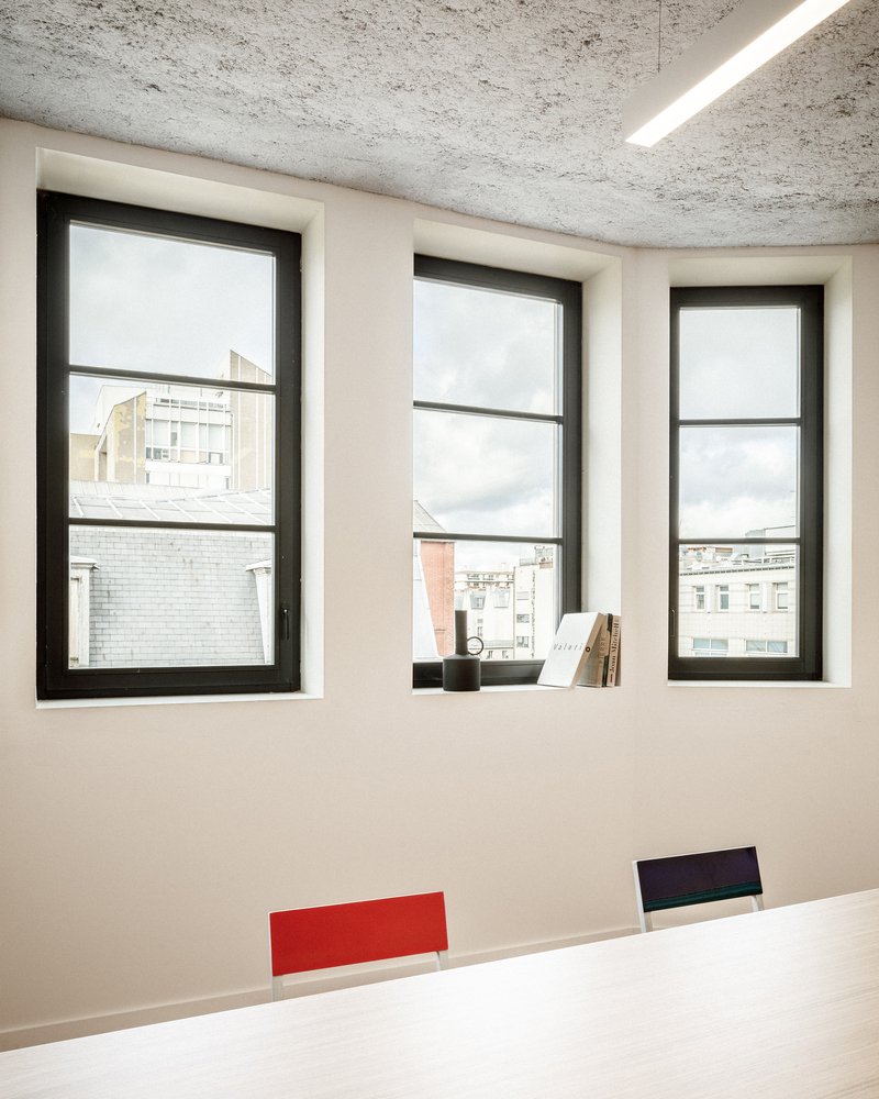The interior design places a strong emphasis on materiality. The architects focused on creating a coherent material palette that both respects the building’s original structure and offers a timeless aesthetic. Some of the materials used in the renovation, such as bricks, were recycled on-site, while others from deconstruction were reused off-site. The result is a minimalist and clean design that allows the building's technical elements to remain visible and encourages future adaptability.