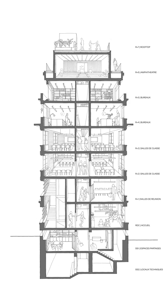 Located in the heart of Paris' 11th arrondissement, the L'ARO Graduate School stands as a prime example of adaptive reuse architecture. Originally constructed as the Bluets Clinic, this historic building has been expertly transformed into a dynamic educational space. Designed by SAME architectes, the renovation addresses both programmatic and technical challenges, incorporating flexibility, sustainability, and a deep respect for the building’s history. The result is a vibrant space that serves not only as a school but also as a potential coworking space, housing complex, and fitness center, all while maintaining a strong architectural identity.