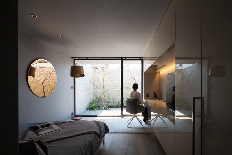 Light plays a central role in the spatial experience. A north-facing skylight above the living room introduces a soft, diffuse glow that cascades down the staircase, reaching the first-floor entrance. The private courtyard further enhances the home’s natural illumination, ensuring that even secluded areas feel bright and open.