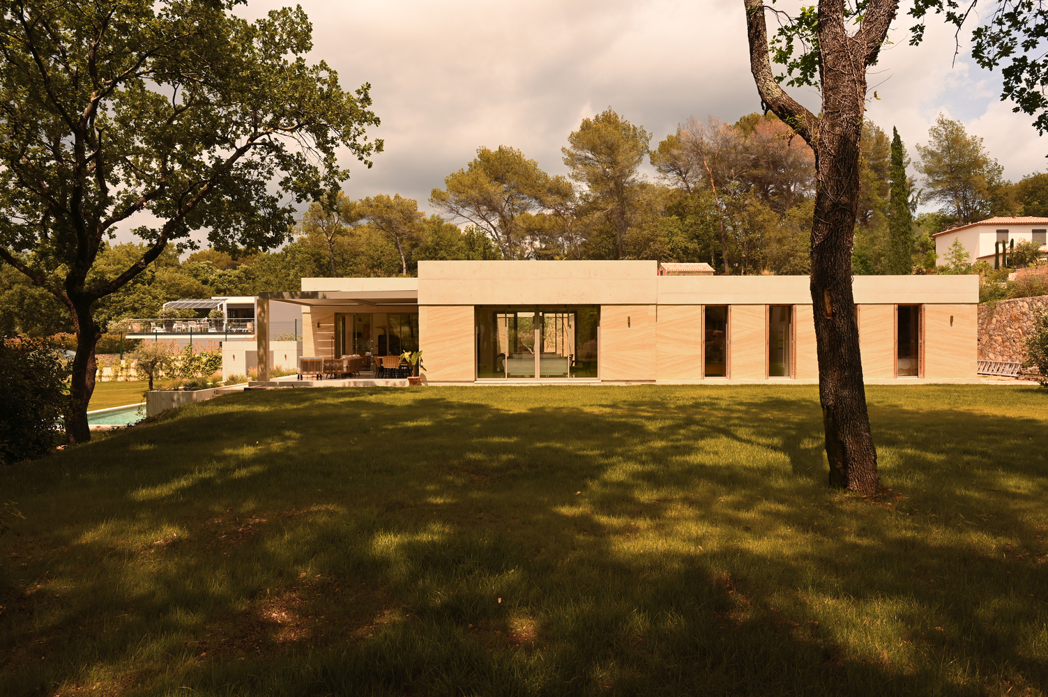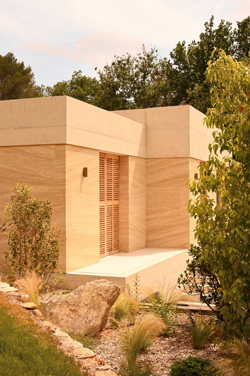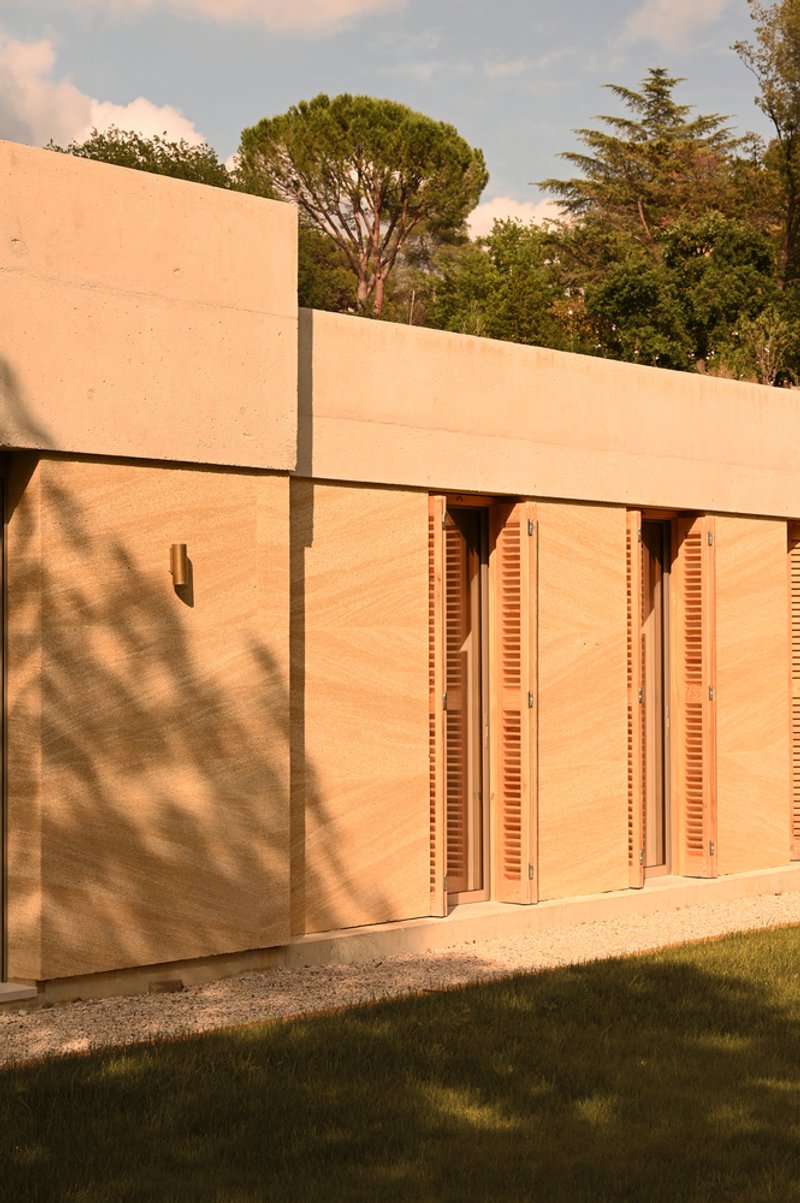 A key material used in the villa's design is Stone of Vers, an ochre shell stone native to the region. This material is not only beautiful but also functional, offering thermal inertia and natural humidity regulation. The stone is integral to the villa’s passive design strategy, helping to maintain comfortable indoor temperatures year-round while reducing the need for artificial heating or cooling.