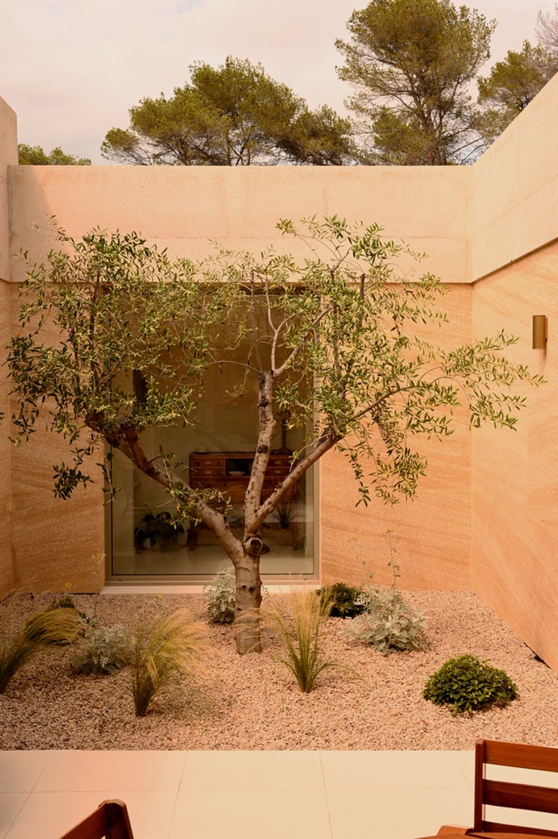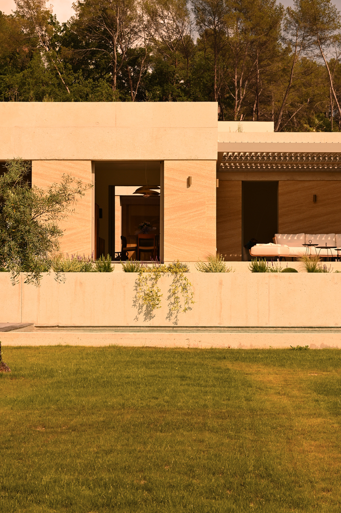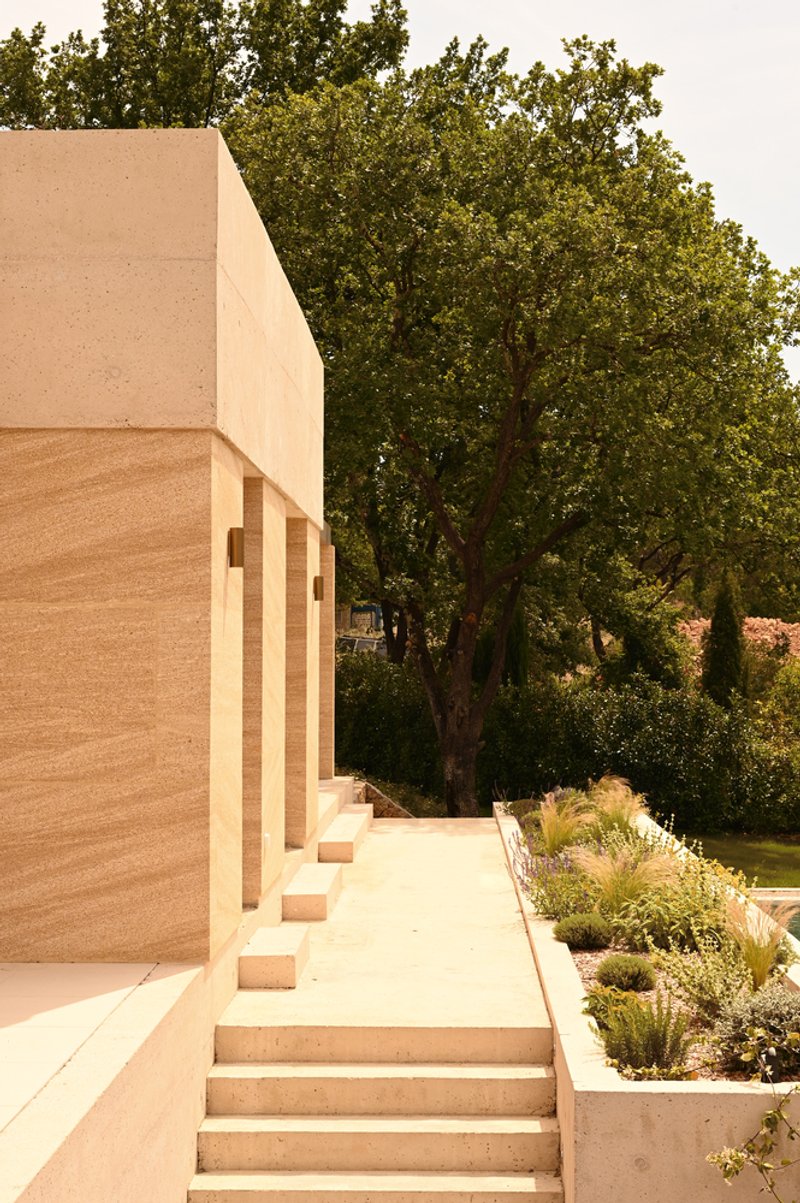 The architects also used sanded tinted concrete in the interiors. This material, processed similarly to stone, reveals its golden hue and rough texture, contributing to the villa's connection to the earth. Concrete is a material that’s both essential and emblematic of the Mediterranean region, adding a contemporary touch to the home’s overall design.