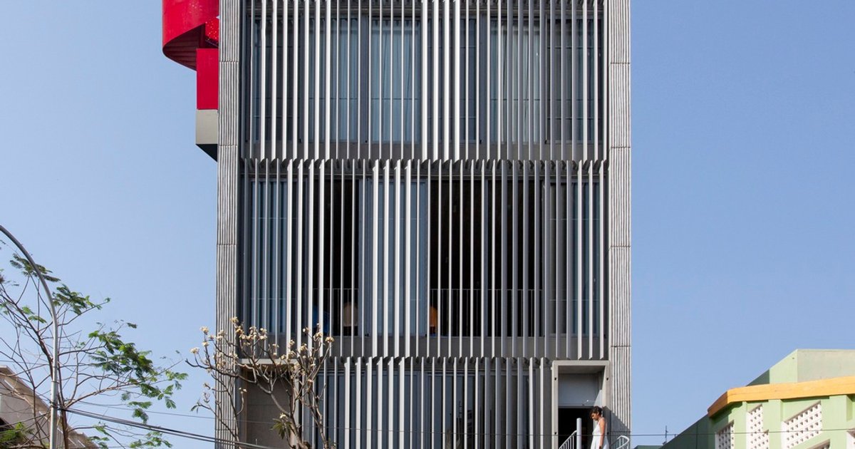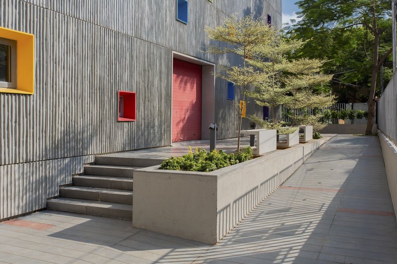 Positioned on a 540-square-meter plot, the building embraces the coastal environment and Chennai's tropical climate. The design revolves around the concept of open, free-flowing volumes that promote visual connectivity and flexible learning. Upon arrival, visitors are greeted by a tree-lined entrance court featuring steps and a ramp, leading into an atrium-like central volume.