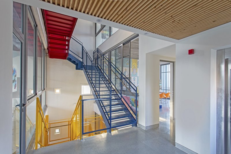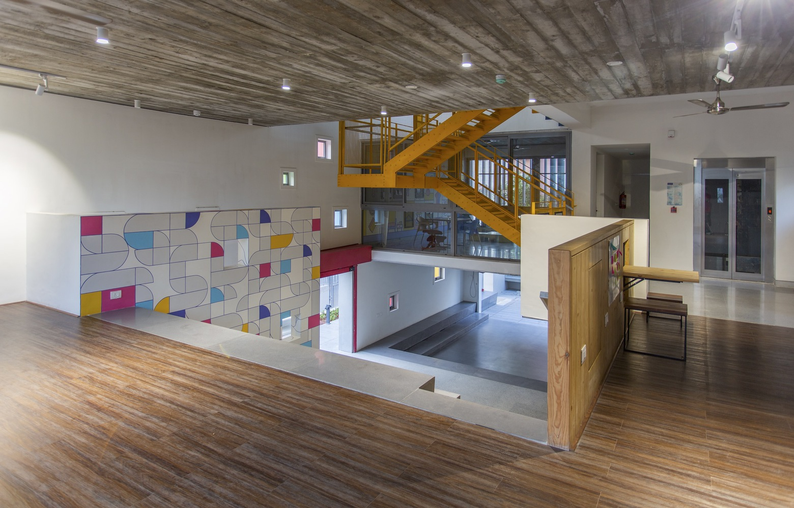 - Intermediate Levels: Five classrooms symmetrically placed around the central atrium.