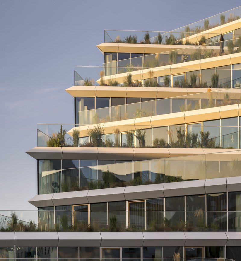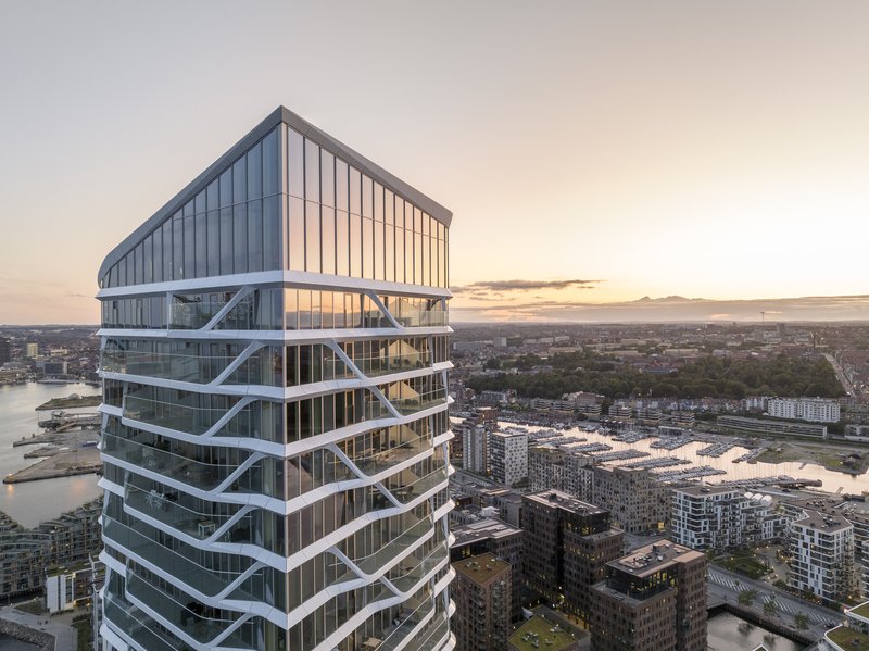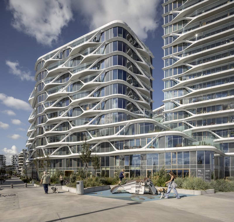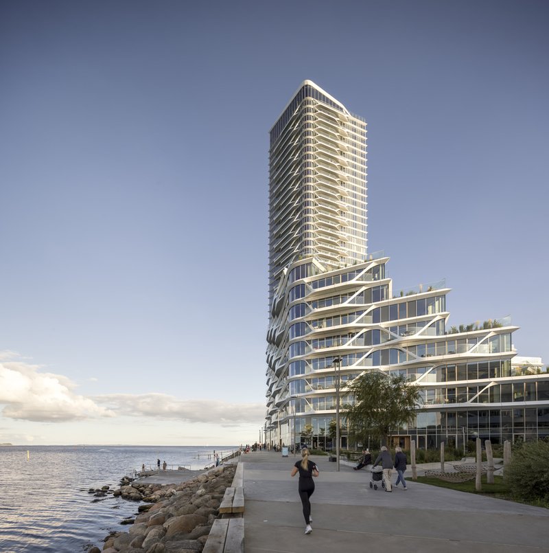 As a towering waterfront landmark, the Lighthouse Building exemplifies progressive Danish architecture. Its rhomboid tower with rounded corners creates a slender, elegant profile, designed to impress from every angle of the city and harbor. The façade draws inspiration from water patterns, featuring parametrically optimized lightweight prefab panels that unify the multiple structures while offering visual texture and architectural cohesion.
