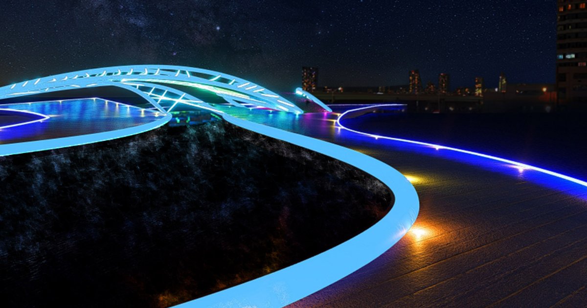 Most pedestrian bridges ask only to be crossed. Lightwell District asks to be inhabited. Three white structural ribs arc over a dark waterway, their surfaces laced with programmable LED systems that shift from cool cyan to deep violet, turning a piece of transit infrastructure into a beacon that draws people in rather than simply moving them across. The ambition here is to collapse the distance between engineering and atmosphere, making the bridge itself the destination.