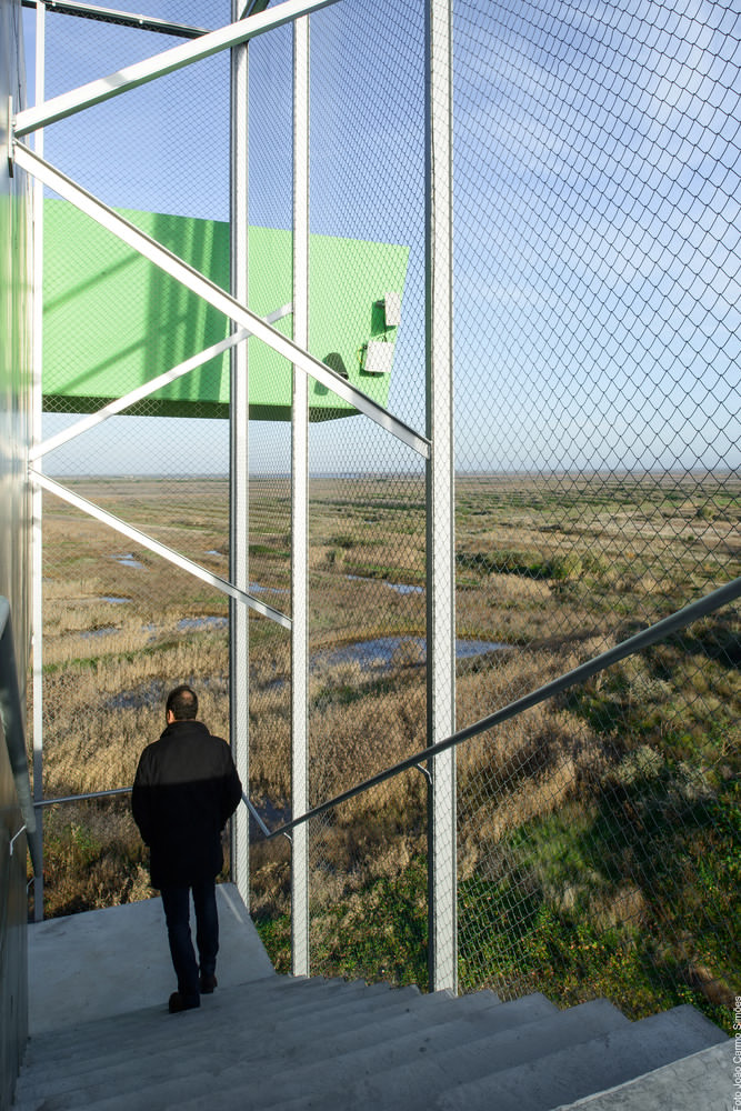 - Exterior: Painted green steel and concrete surfaces along the main deck and western ramp, harmonizing with the surrounding landscape.