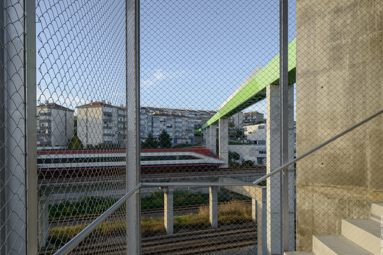 While modest in scale at 220 meters, the pedestrian overpass plays a pivotal role in repairing the city’s fractured urban fabric. Acting as both a physical and visual link, the bridge connects residential areas west of the N10 road to commercial spaces and the natural landscape of the Tagus Estuary to the east.