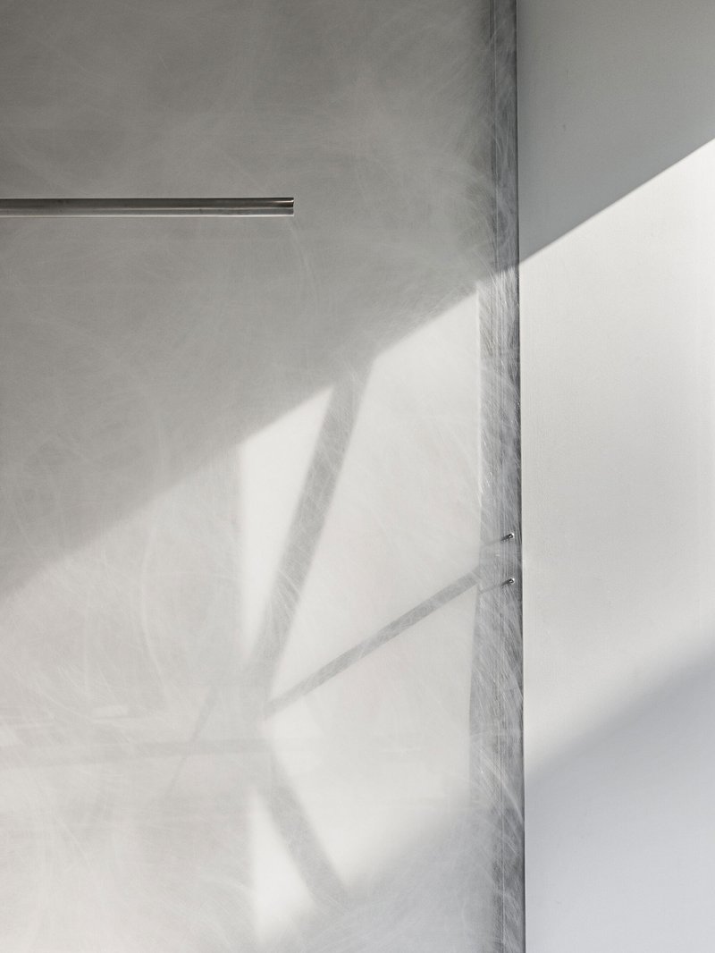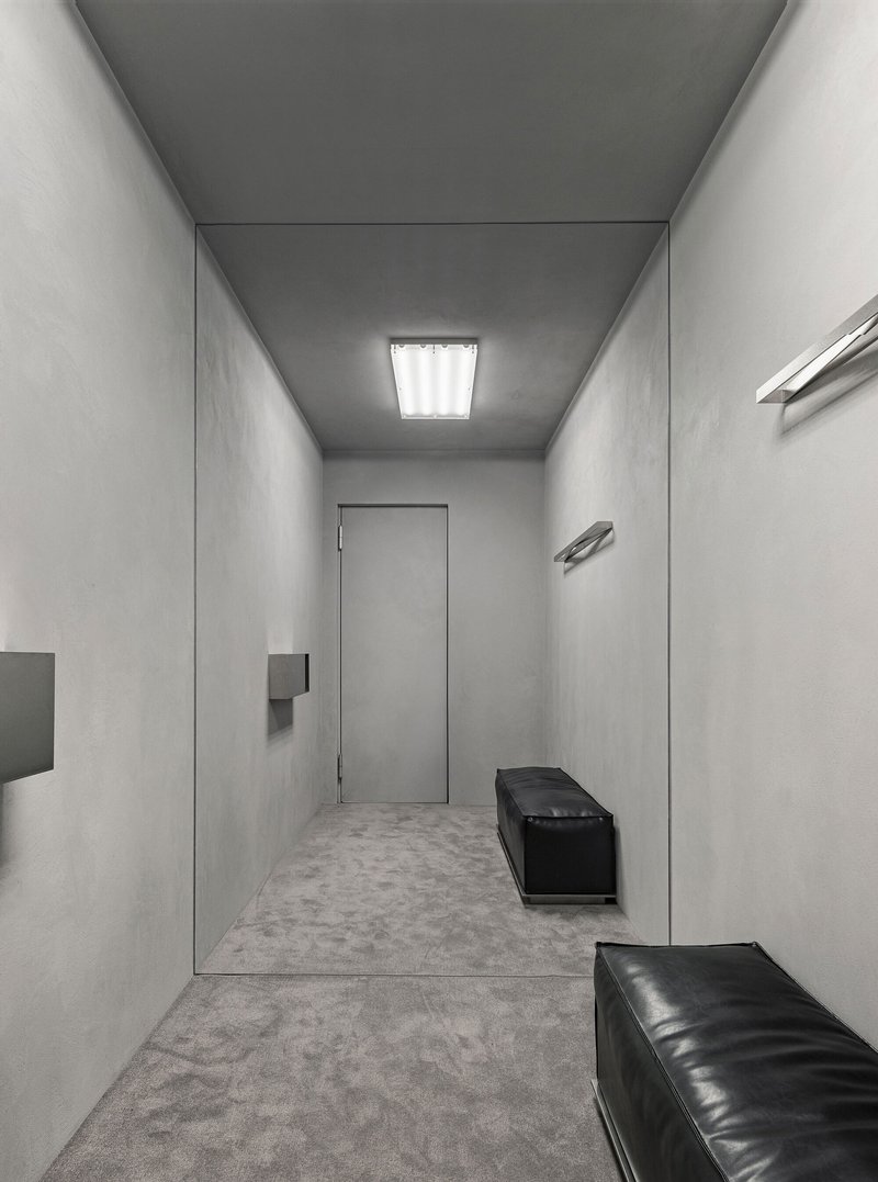 The polished concrete flooring at the entrance subtly transforms into smaller-format concrete tiles toward the interior. This shift is almost imperceptible, yet it creates a tactile sense of progression and depth.