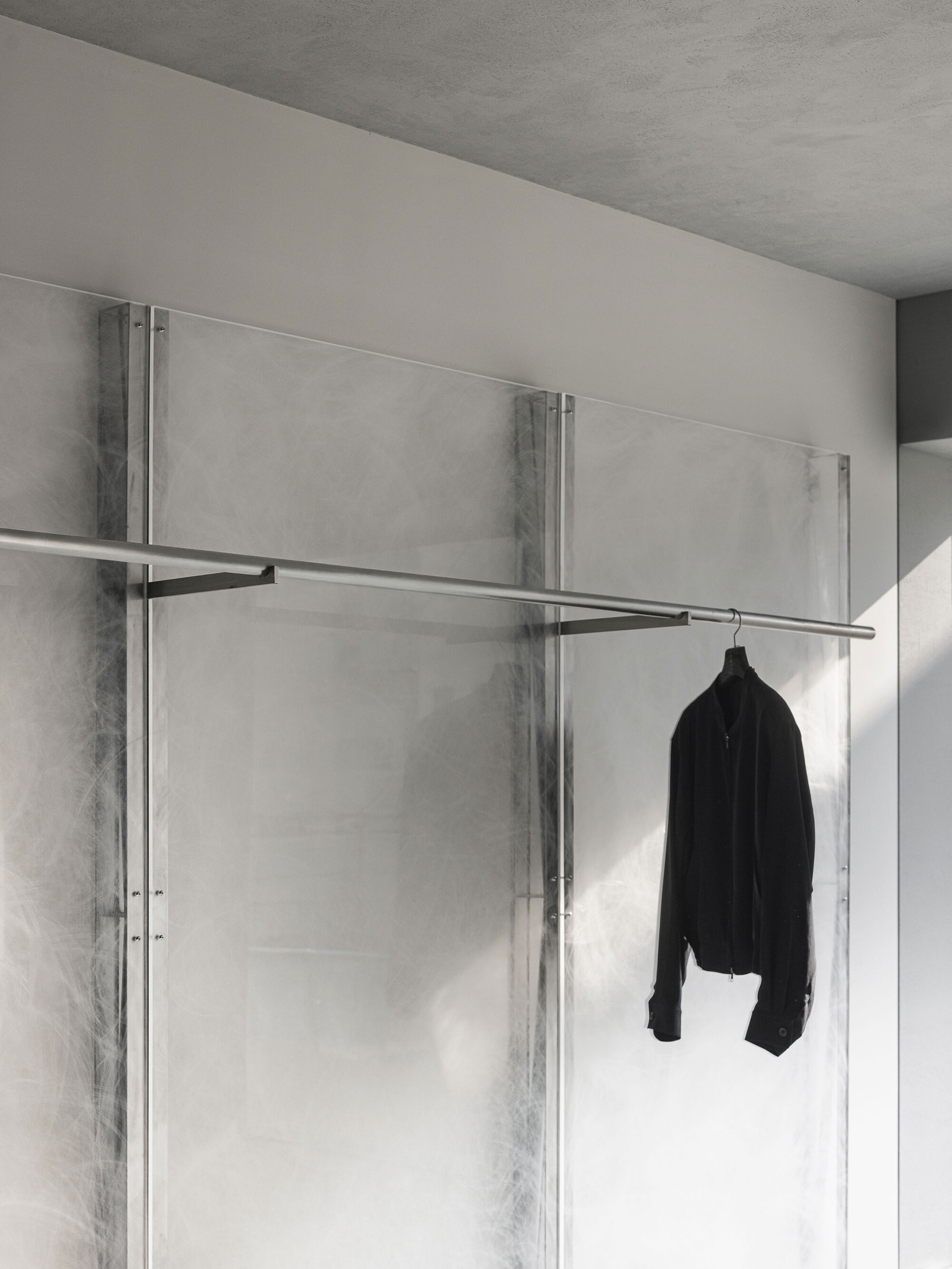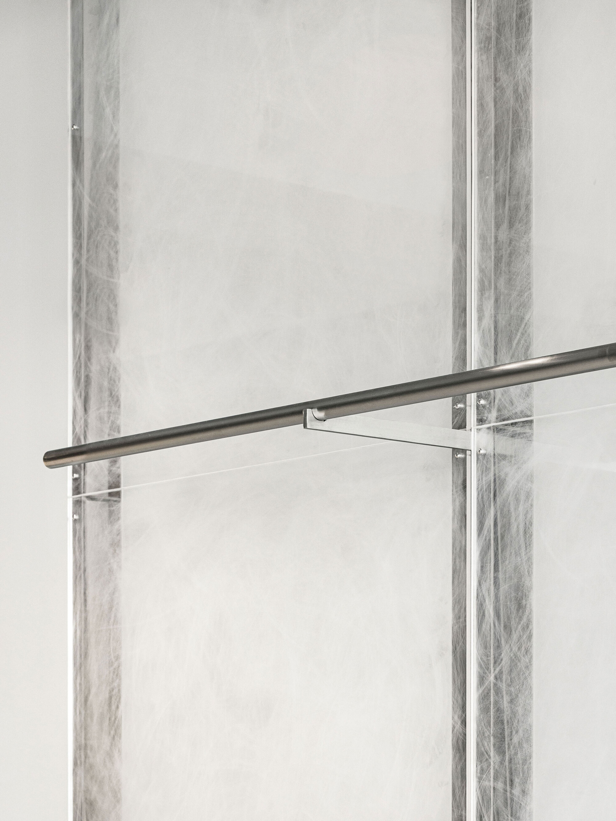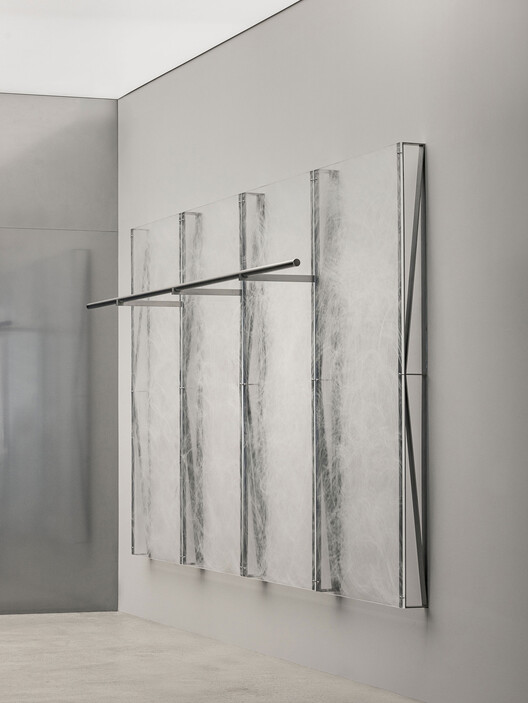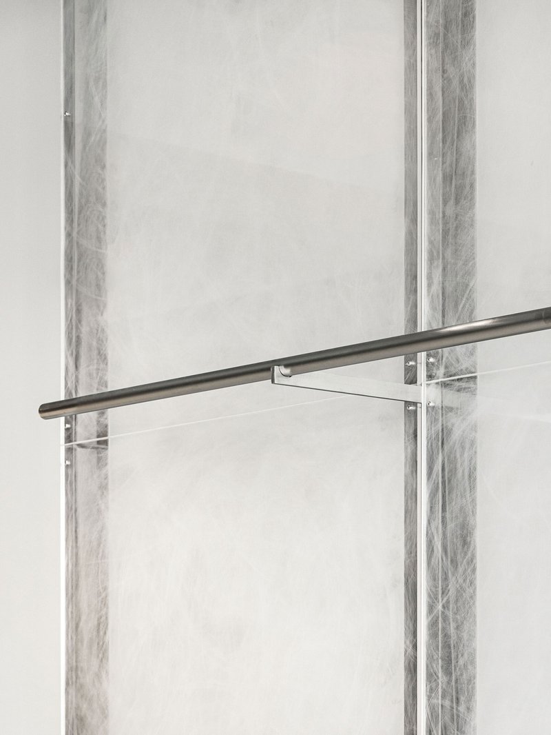 The acrylic wall, hand-finished and subtly reflective, introduces translucency and depth. It filters light rather than reflecting it directly, creating an ambiguous boundary that feels both solid and ephemeral.