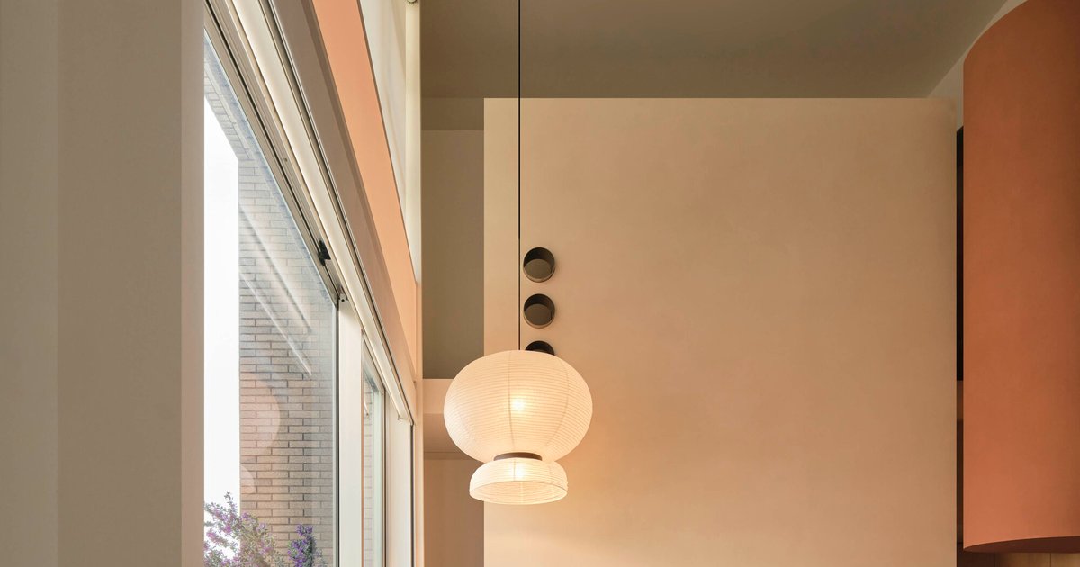Several of the most evocative images capture the apartment at dusk, when artificial light takes over and the interiors glow against the darkening sky. An angled ceiling plane meets white walls beneath the mezzanine, where a pendant sphere light hangs like a small moon. Through a doorway, a rounded soffit detail and dark floor tiles catch the last of the afternoon light. A paper lantern fixture beside a wall with three circular recesses and a framed drawing below completes a vignette that feels curated but not staged.