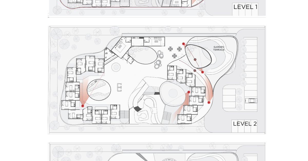 On the second floor, the geometry of the curves creates a condition that limits the amount of direct line of sight. Although the residential area’s corridor is seemingly linear, what lies up ahead is concealed due to the physical form of the curve.The residential terrace is opened up to encourage interaction between the neighbours. However, privacy can still be obtained by limiting the field of view through the curved layout of the rooms.