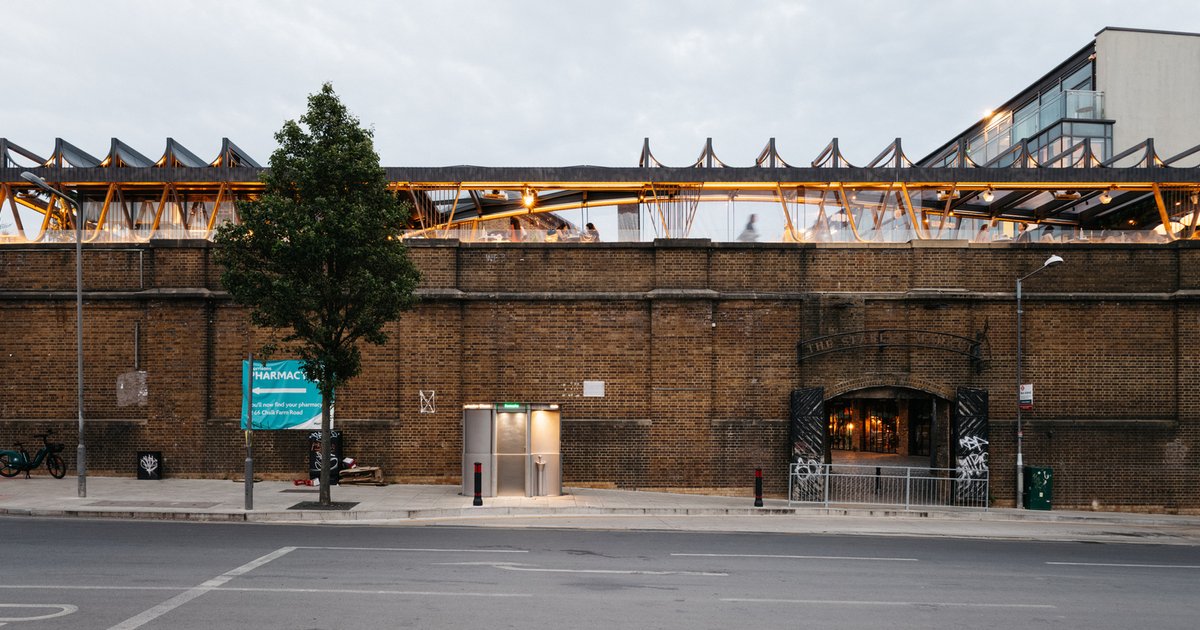 Elevated rooftop bar in Camden by vPPR, referencing historic horse stables with steel frames, curved roof, terraces, and vibrant nightlife views.