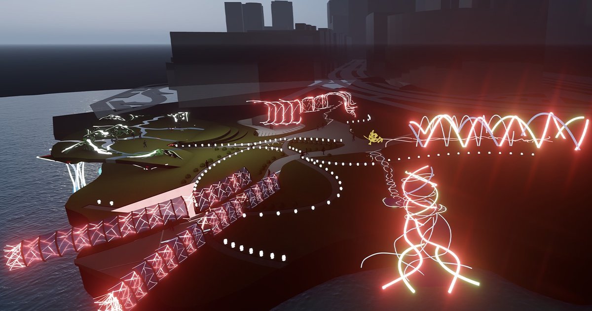 Two paths make up the park. The primary pathway, which features the essence of the follies, is illuminated by LED lights that are embedded in the ground and fade in and out. The main route leads you to all five follies and around the site. The secondary paths are designed to lead you around the site in a less ordered manner; they are less structured. Small lanterns that alternate sides at each crossroads light the auxiliary path. These lanterns serve as places to sit and relax as well.