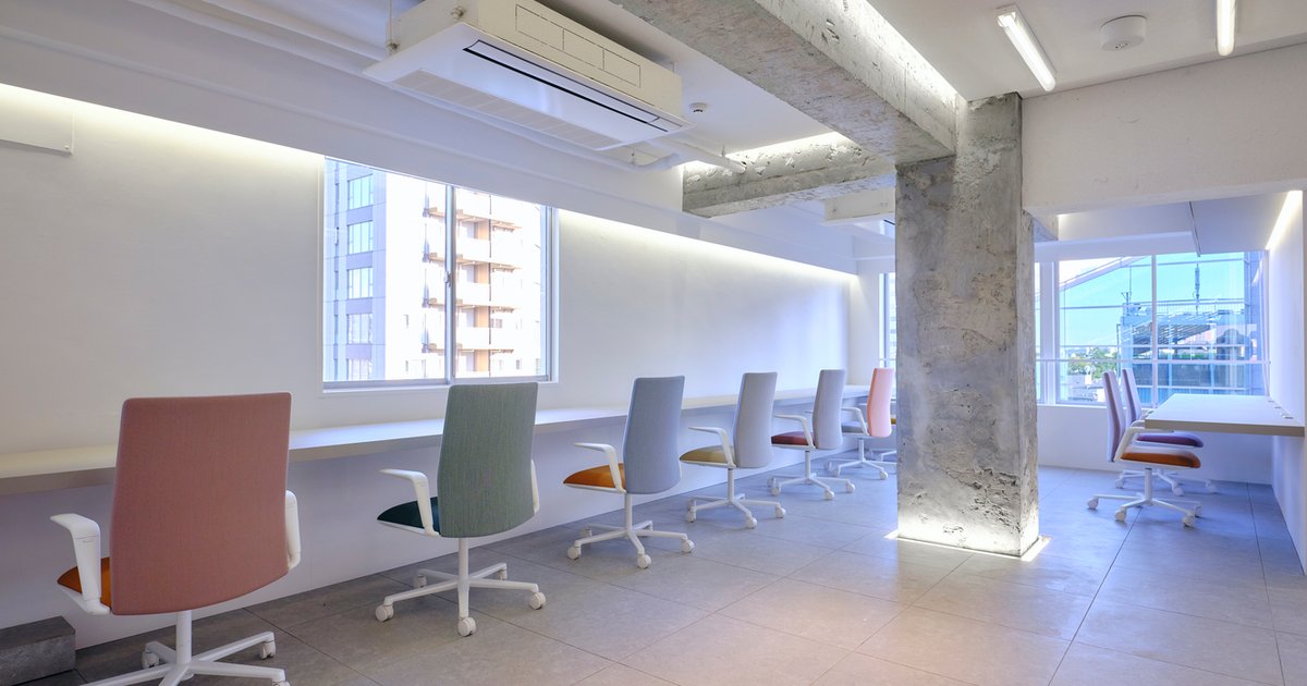 Colorful, transparent office design maximizing natural light, flexible zoning, and collaboration within a renovated Tokyo workspace.