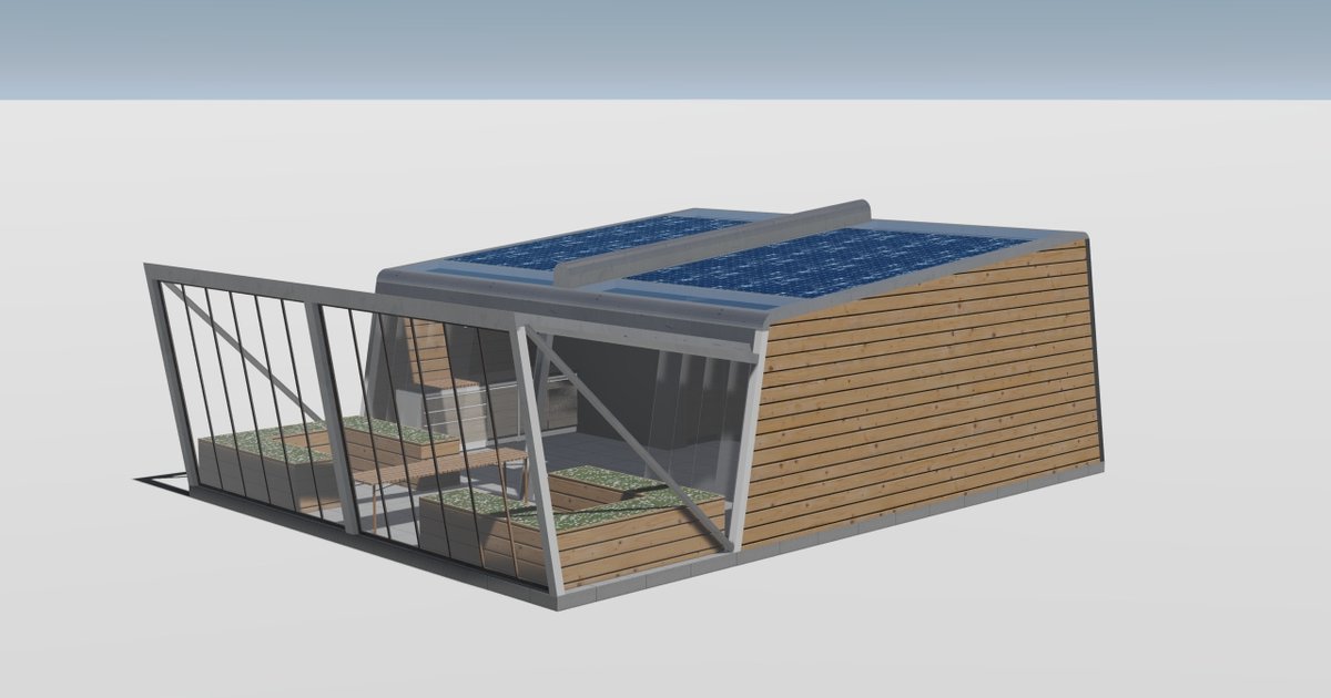 The main construction is made in steel. The walls are made of sandwich elements consisting of a layer of polyurethane sandwiched into a layer of wood on both sides. The wood is treated to be water repellent.