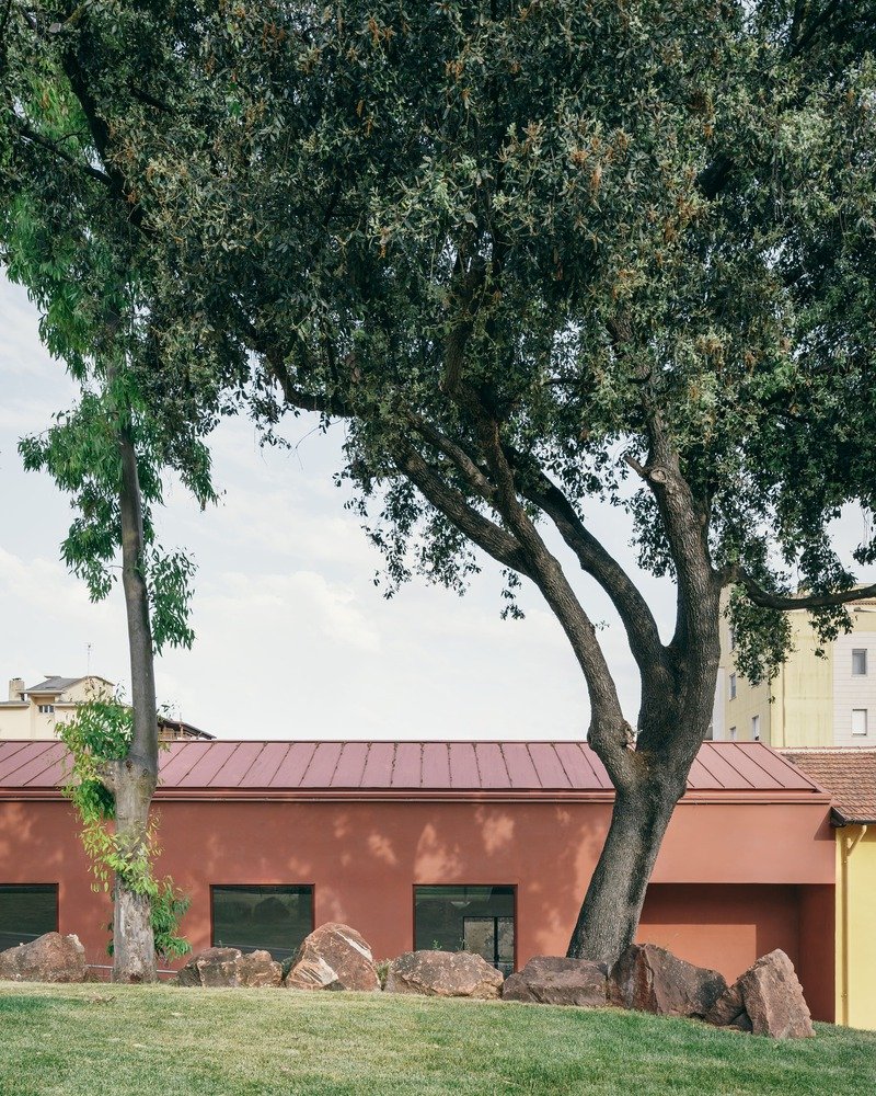 Adjacent to the historic structures, the Engraving Pavilion expands through the introduction of a new brick-red volume. The addition: