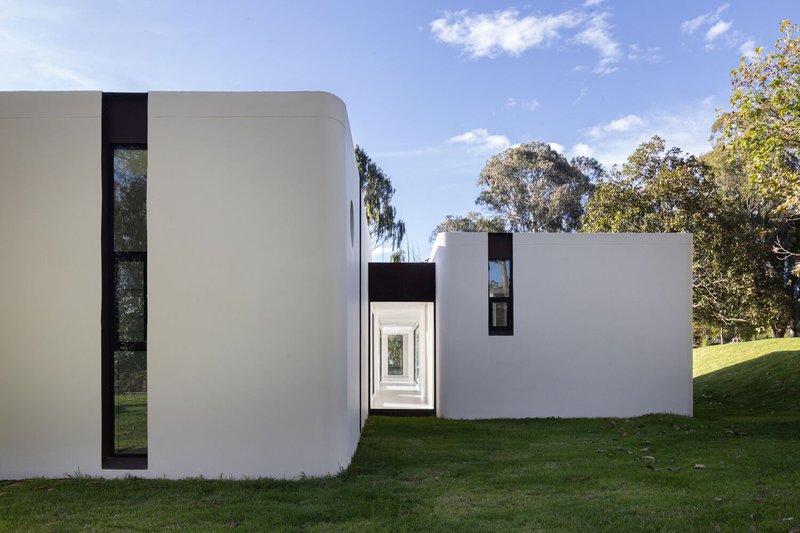 The home employs a simple yet elegant material palette: smooth white planes, softened vertex lines, and continuous surfaces highlight the abstract sculptural character of the house. The juxtaposition of these white volumes against natural surroundings reinforces the concept of an architectural object that is distinct yet integrated with its context.