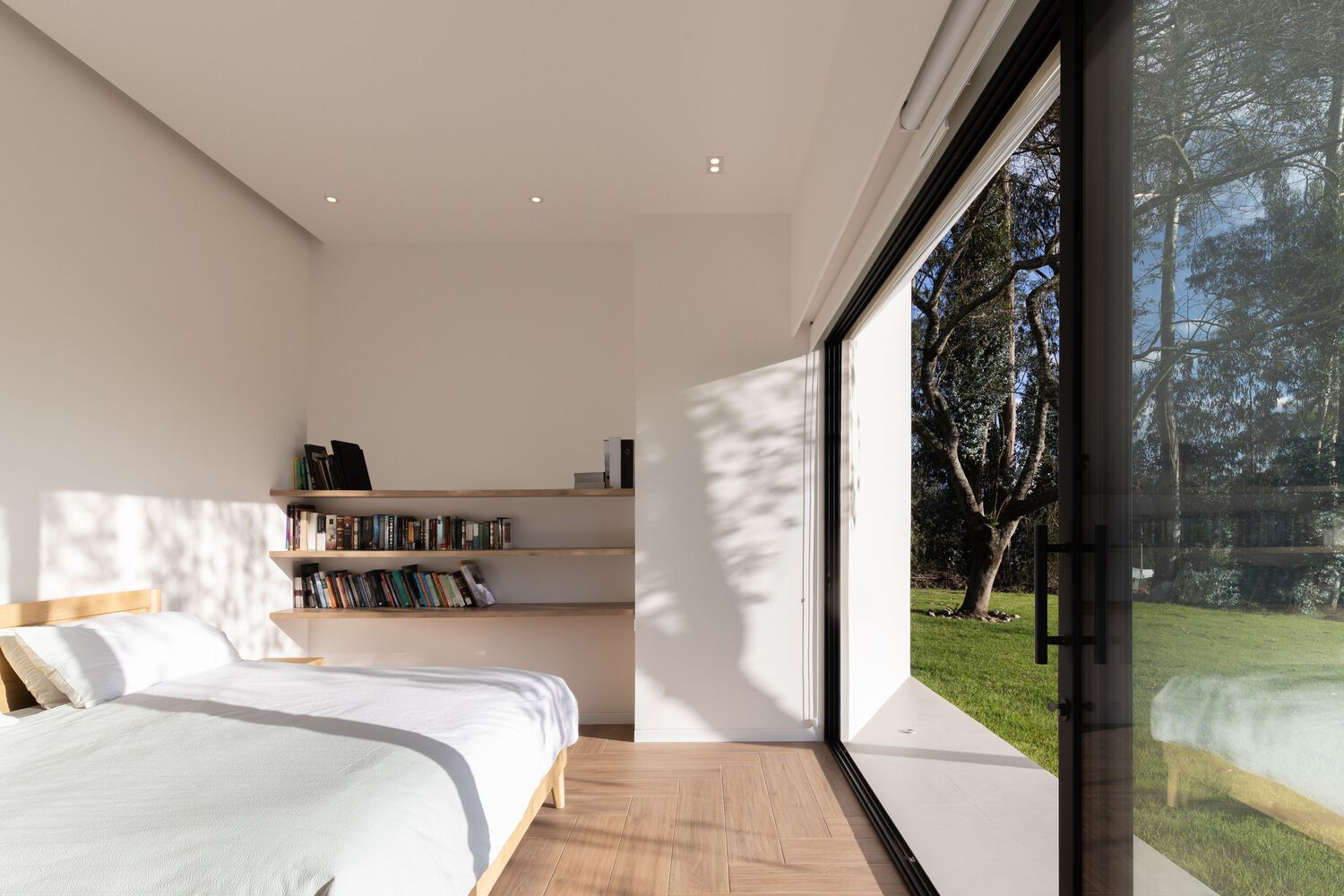 Transition spaces between the volumes are designed to feel like a garden walk, creating a fluid experience that blurs the line between interior and exterior. Concave spaces and visual openings further enhance transparency, bringing light and greenery into the home while reinforcing the sculptural quality of the architecture.
