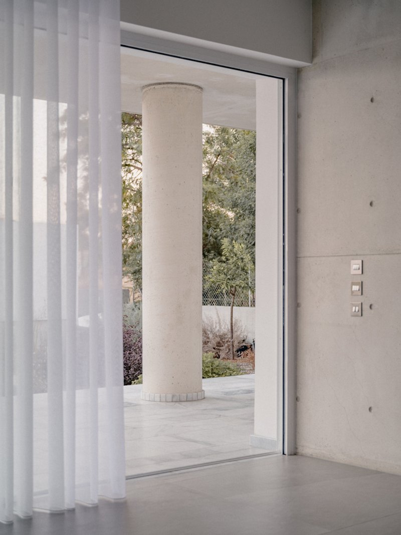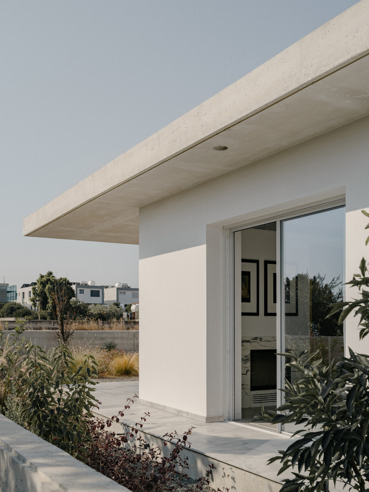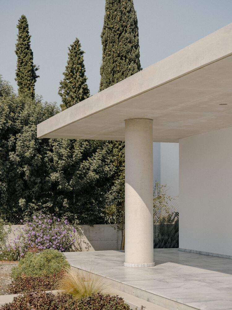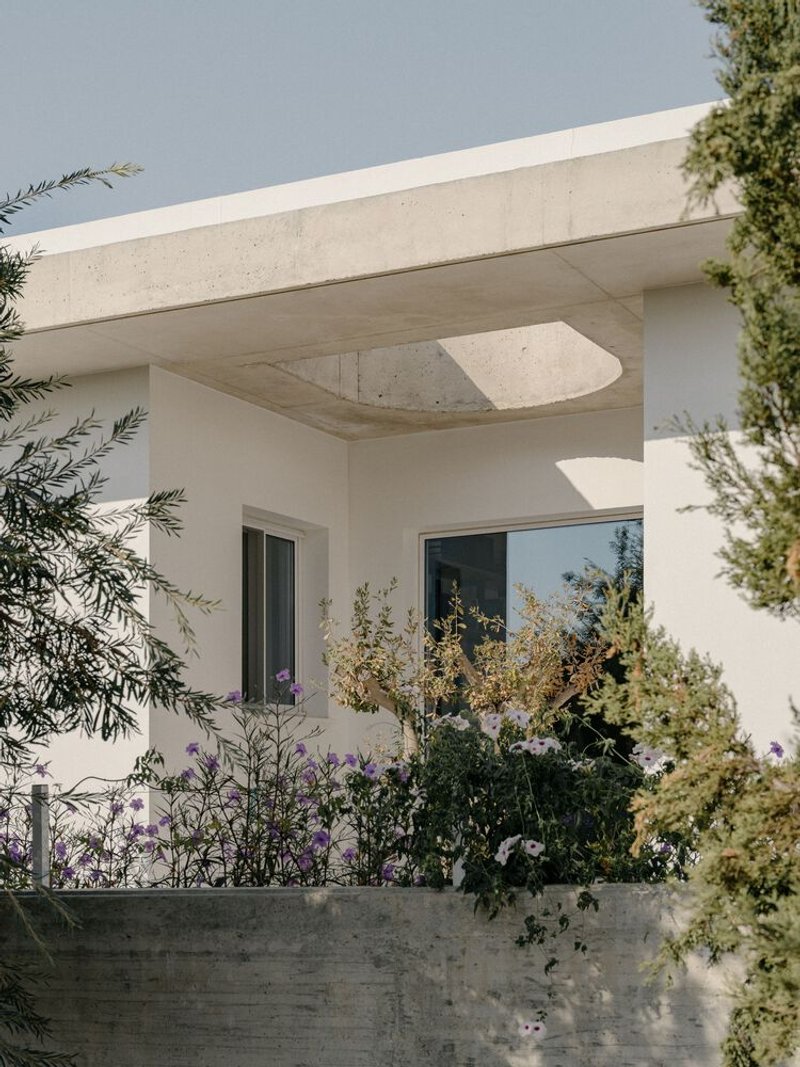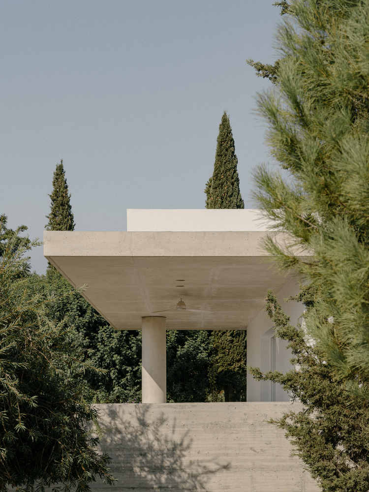 A defining feature of the design is the concrete canopy that wraps around the structure. Cast in-situ, this canopy serves a dual function—shielding the interior from sun and rain while also offering shelter to the perimeter outdoor spaces. This protective element emphasizes the balance between indoor and outdoor living, a key consideration in Mediterranean architecture.