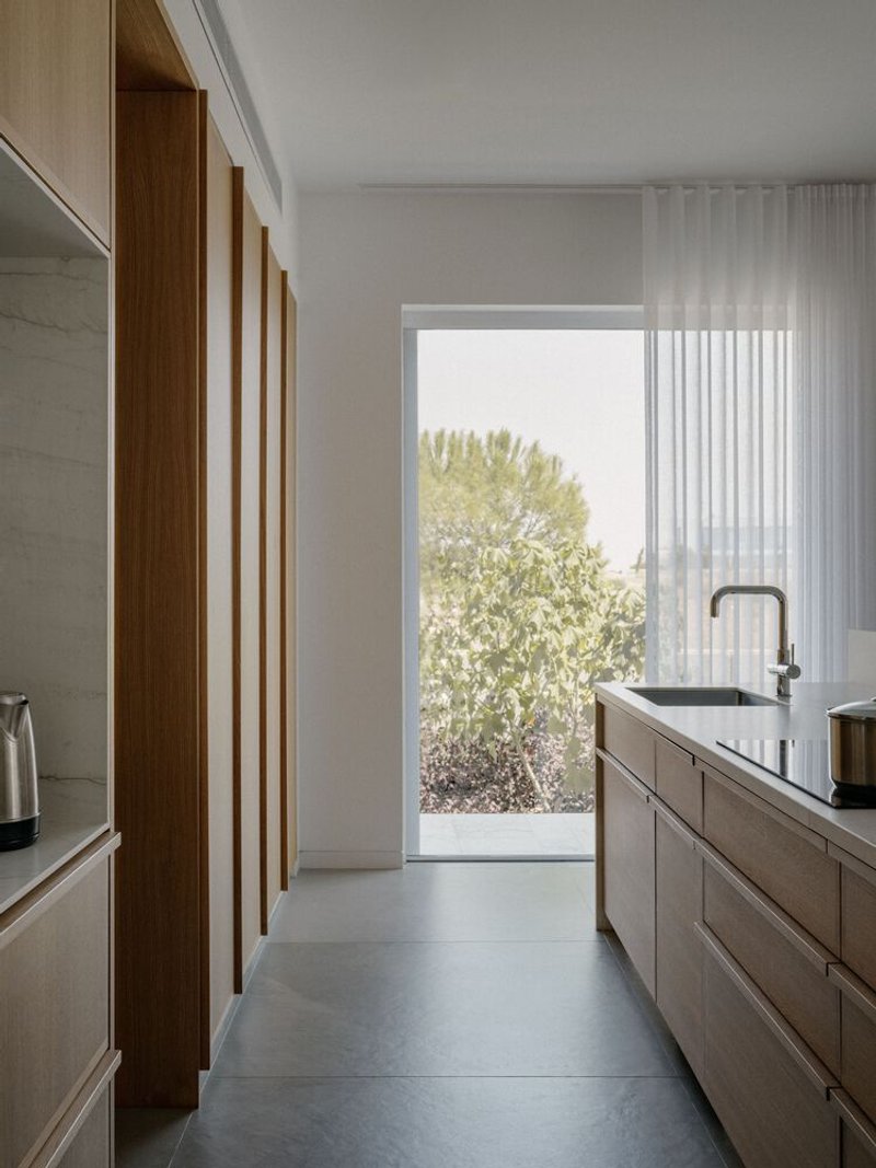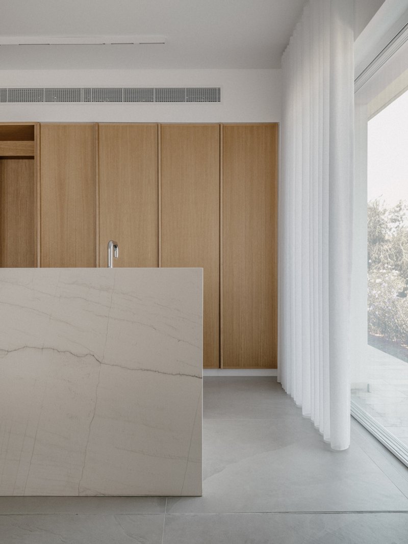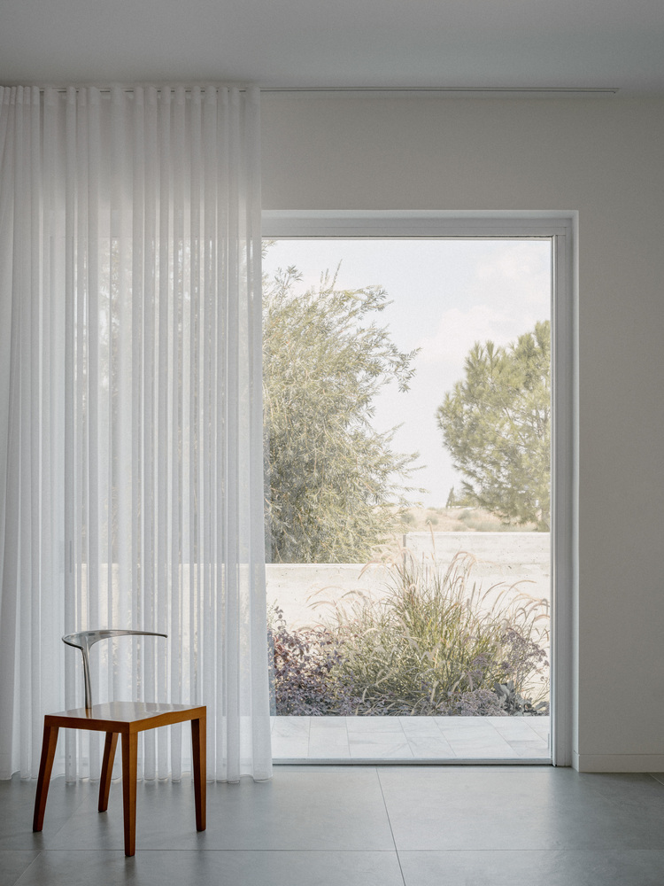 The eastern zone accommodates the main living spaces, designed with expansive openings that frame views of the surrounding landscape. These large openings not only flood the interiors with natural light but also create a seamless connection between the indoor and outdoor environments.