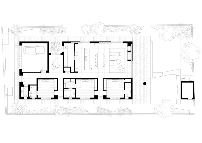The residence is strategically positioned towards the front of a narrow rectangular plot, allowing for an expansive garden at the rear. A key design element is its table-like structure, which not only anchors the house but also enhances spatial efficiency. This architectural choice optimizes the relationship between built and open space, ensuring that the house does not feel enclosed despite its urban setting.