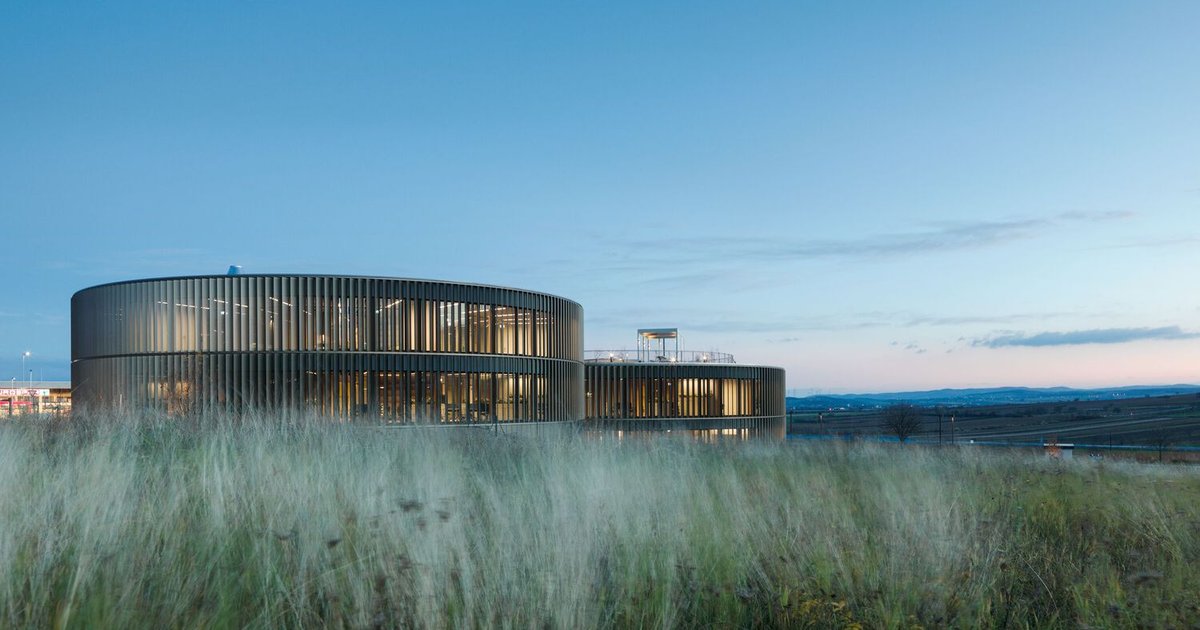 The MAM Competence Center demonstrates exemplary sustainable architecture. Its compact cylindrical shape reduces surface area while maximizing volume, improving thermal efficiency. Renewable energy fully covers heating and cooling demands, while sensor-controlled lamellae adjust automatically to sun exposure, minimizing heat gain in summer and storing energy during winter.