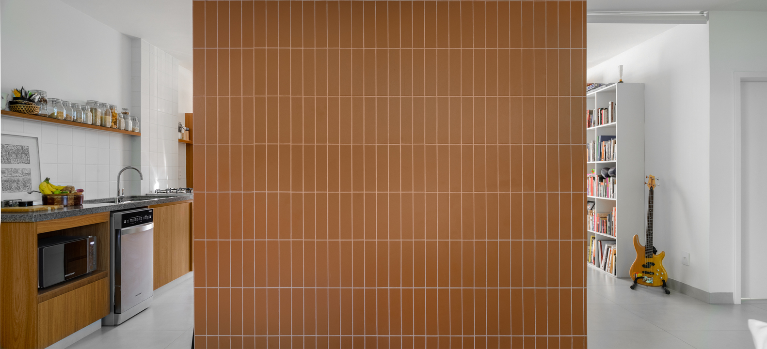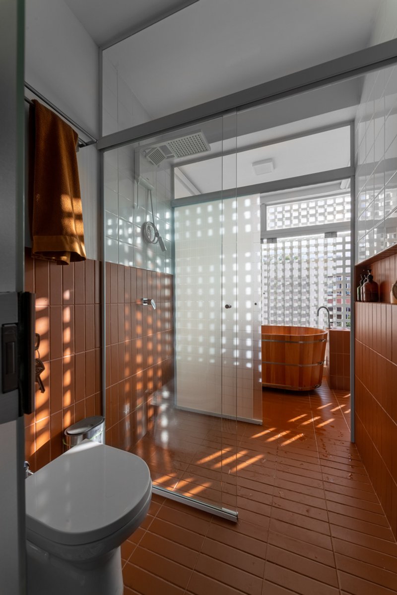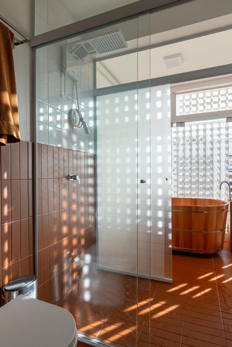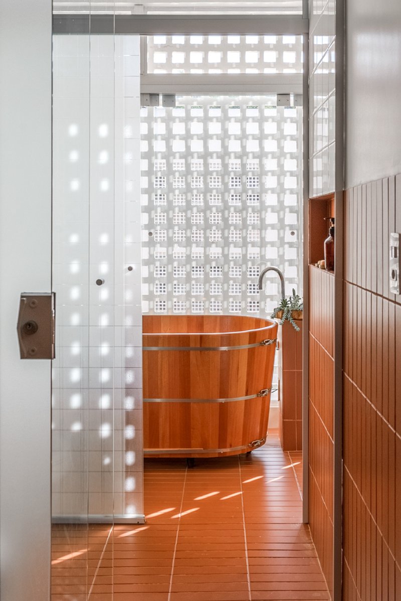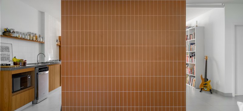 - Terracotta tile cladding for the bathroom island, referencing iconic local buildings like Cine Brasília and the “tesourinhas do eixão”