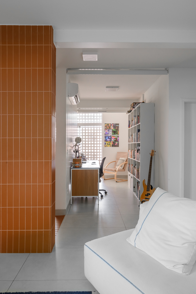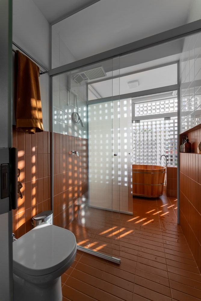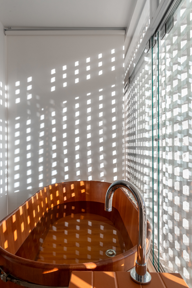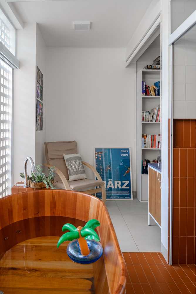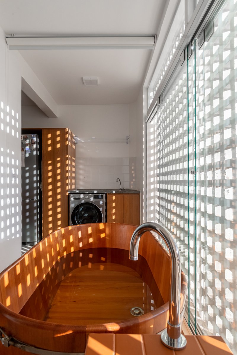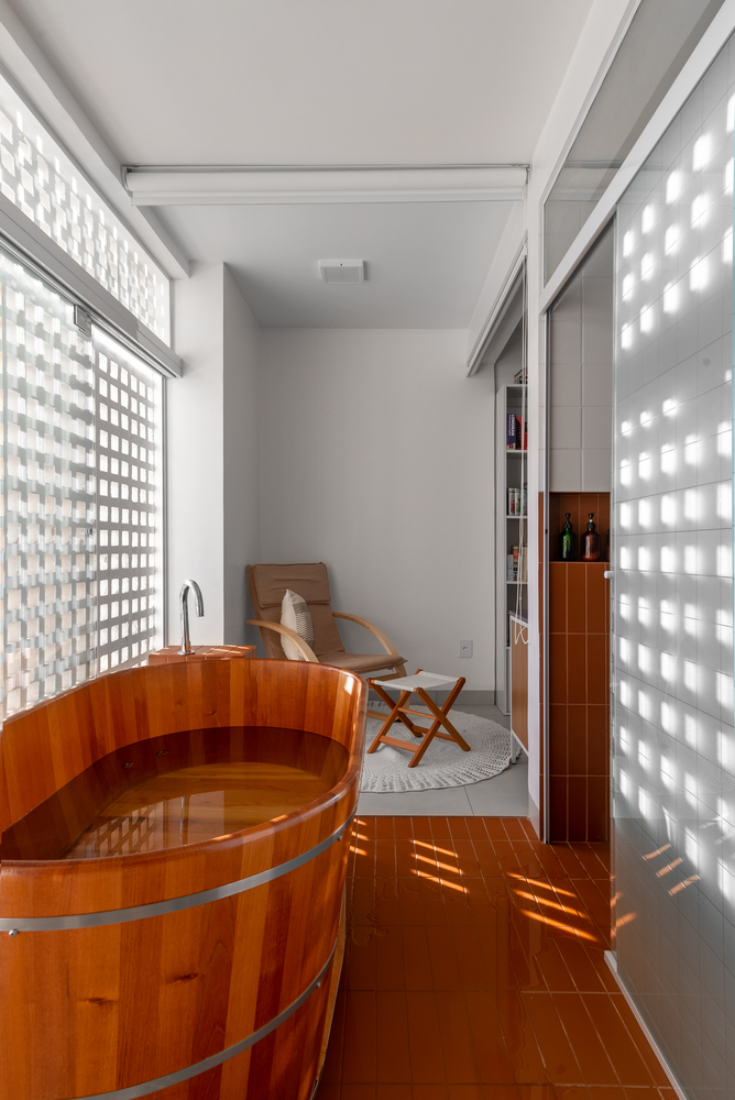 Rather than being hidden away, the bathroom became a central, accessible island, surrounded by the apartment’s social zones. On one side lies the kitchen, and on the other, an office. The living room sits at the front, and at the back, a unique space with a hot tub opens onto a façade of cobogós, functioning alternately as a social balcony or private retreat.