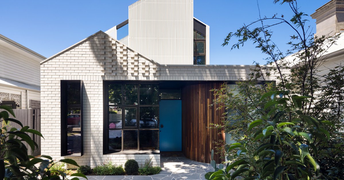 Externally, Maree House fits effortlessly within the Yarraville streetscape. The white brick façade and painted battensbring a tactile quality, while the timber-lined entry introduces warmth. The pop of blue at the main door and soft pink accents throughout—especially the spiral staircase and joinery—add an element of playfulness.