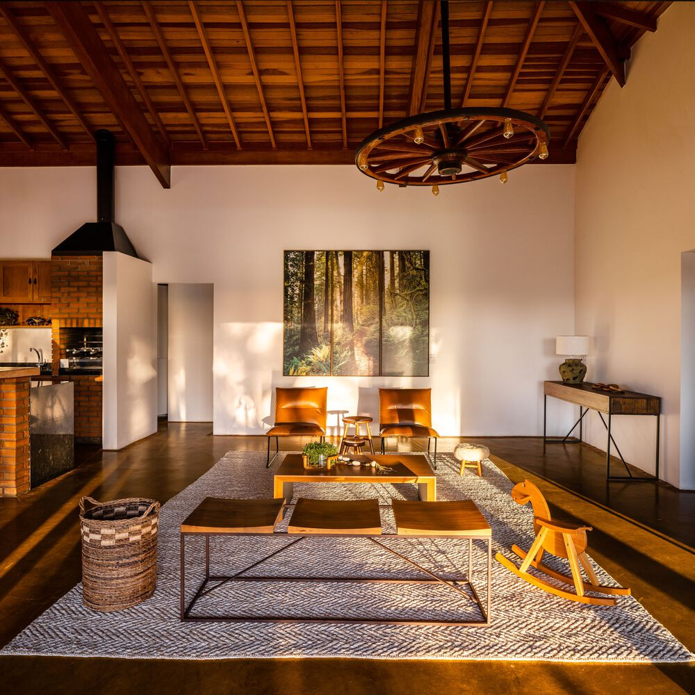 The design brief focused on retaining the house’s original volume, a characteristic example of 20th-century countryside architecture in Brazil. Rather than erase its past, the architects chose to preserve key structural elements and enrich them with modern construction techniques and carefully curated material choices. The result is a home that maintains its historical essence while seamlessly integrating modern sophistication and expanded spaces to accommodate the family’s evolving needs.