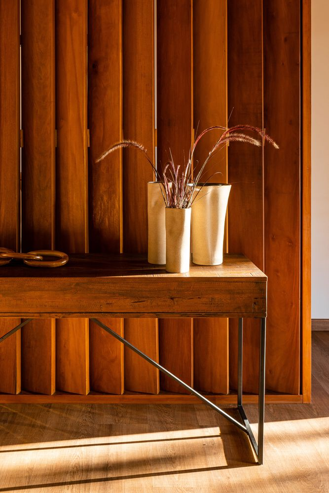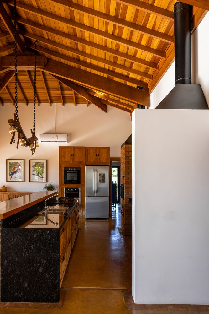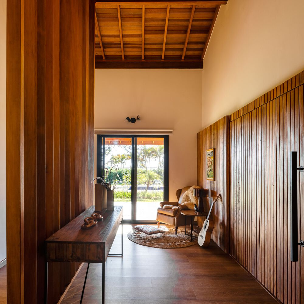 A defining feature of the Marilu House renovation is the extensive use of wood — both as a structural and decorative element. Warm timber surfaces appear in the exposed pillars of the veranda, the gourmet counter, the TV room paneling, and the pitched roof, enhancing the project’s natural warmth and textural richness.