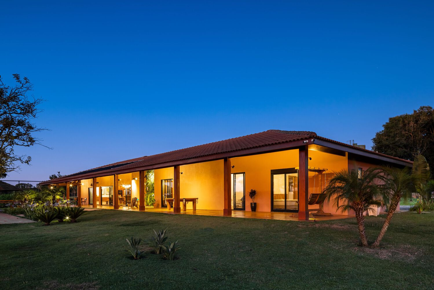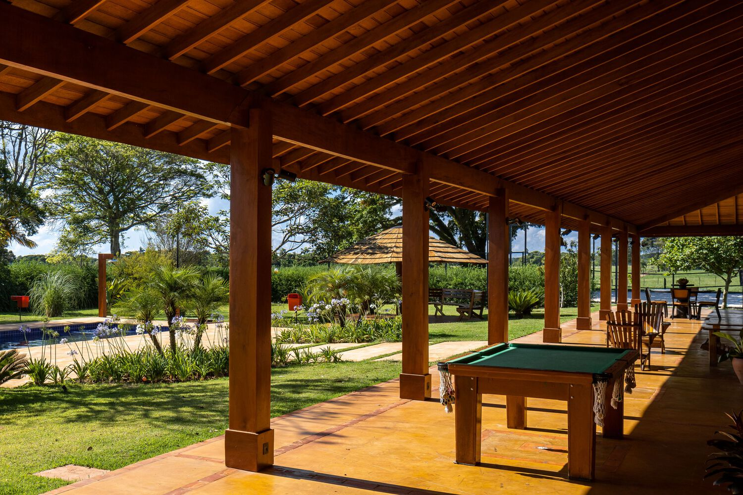 The outdoor veranda is arguably the most vital space in the entire project. Covered and expansive, it supports a seamless indoor-outdoor flow, inviting guests to relax, dine, and gather in comfort. Just steps away, the dark blue-tiled swimming pool adds a dramatic contrast to the main house’s warm tones, becoming a focal point of the outdoor leisure experience.