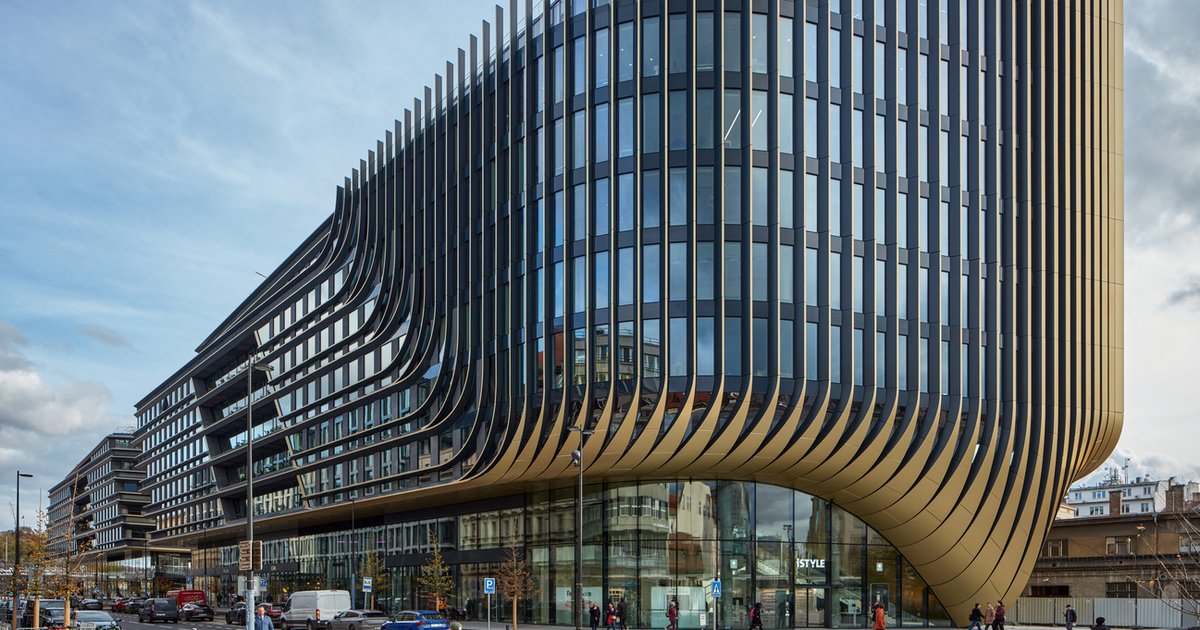 The building’s design consists of seven storeys on the eastern section and nine storeys on the western end, with a fluid, dynamic facade characteristic of Zaha Hadid’s signature style. External fins provide solar shading in the summer, while the building’s horizontal composition gradually transforms into verticality facing the spires of the Old Town. A cascade of terraces divides the two sections, offering each office floor direct access to generous outdoor spaces, and communal roof gardens provide panoramic city views.