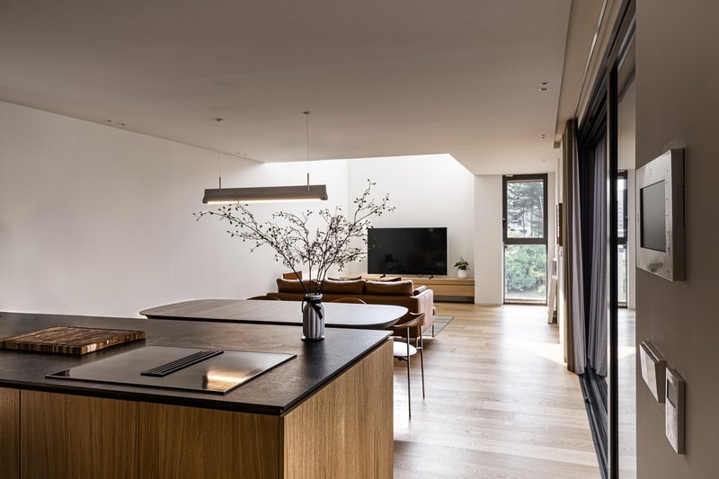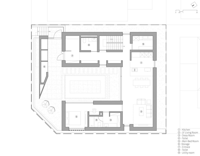 Central to the residence's design is the innovative use of water in the courtyard, introducing an additional layer of privacy and openness. The water feature reflects the sky and surrounding architecture, creating a sense of expansiveness and tranquility. This design choice not only enhances the aesthetic appeal of the courtyard but also serves as a dynamic element that adapts to the residents' needs, offering versatility in its use.