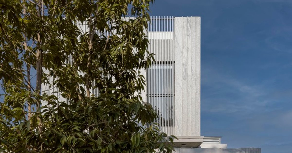 The south-facing façade incorporates carefully positioned stone fins that filter sunlight, creating dappled light patterns inside while reducing glare. This thoughtful design enhances interior comfort and emphasizes a harmonious connection between natural light, materiality, and spatial experience.